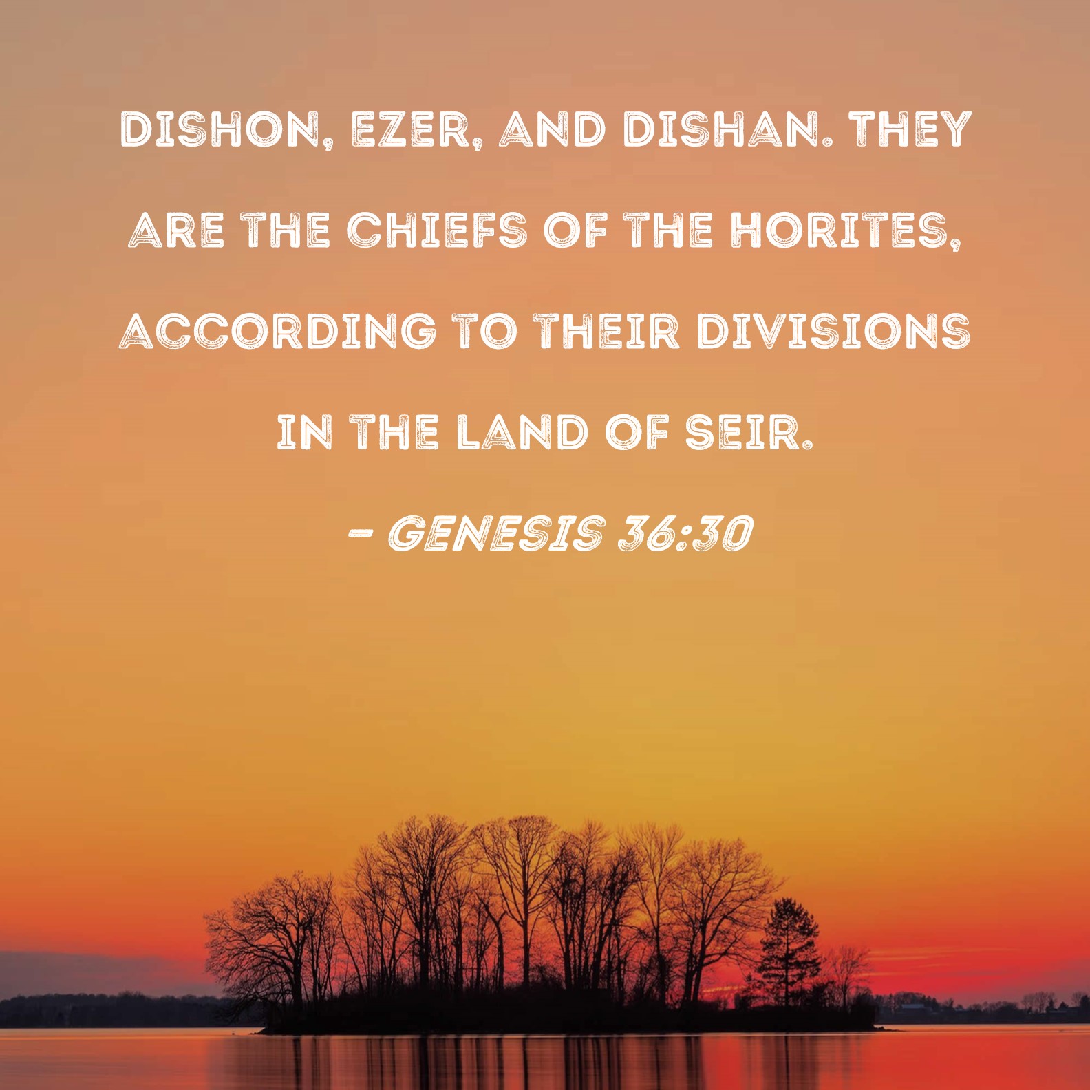 Genesis 36:30 Dishon, Ezer, and Dishan. They are the chiefs of the Horites, according to their divisions in the land of Seir.