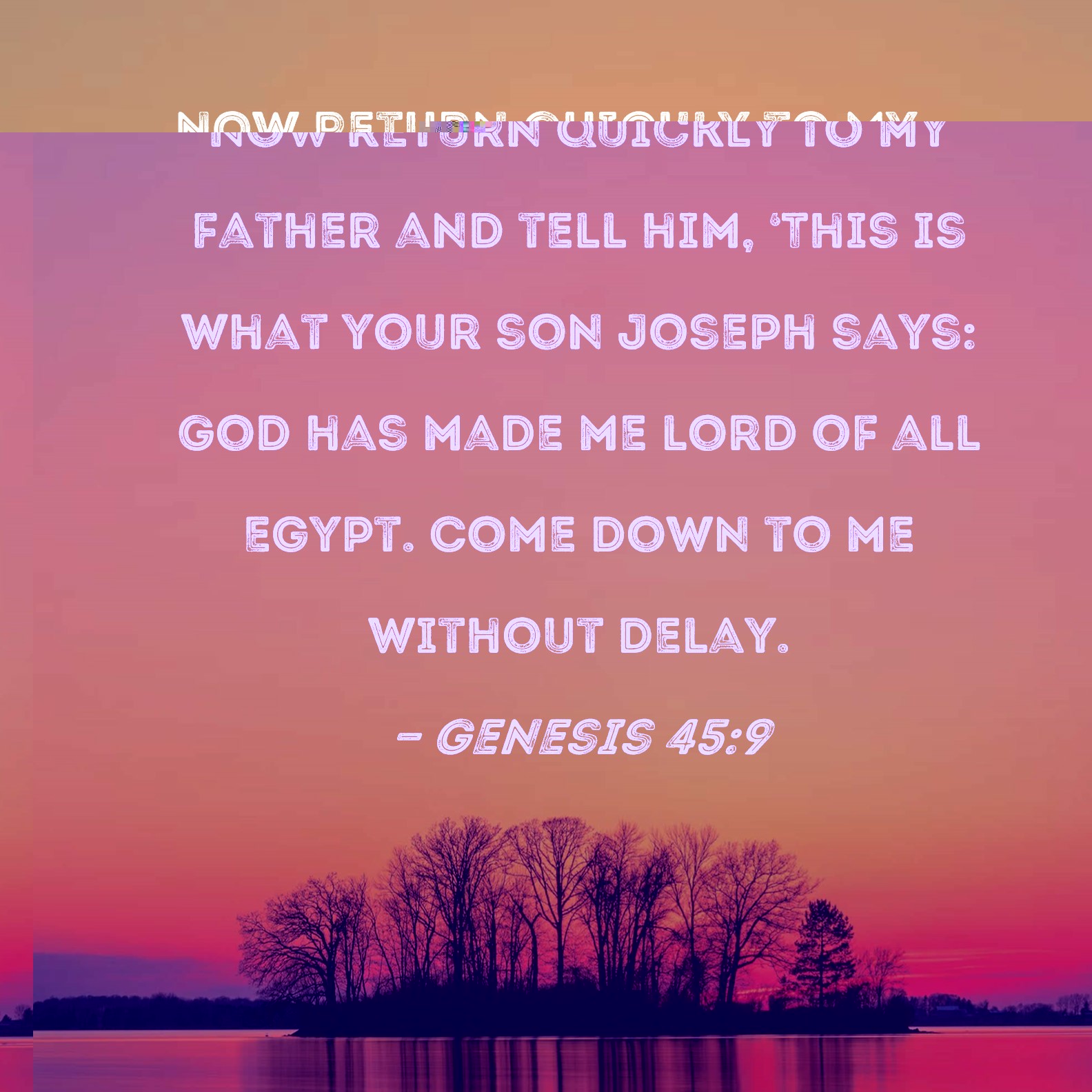 Genesis 45:9 Now return quickly to my father and tell him, 'This is what your son Joseph says: God has made me lord of all Egypt. Come down to me without delay.