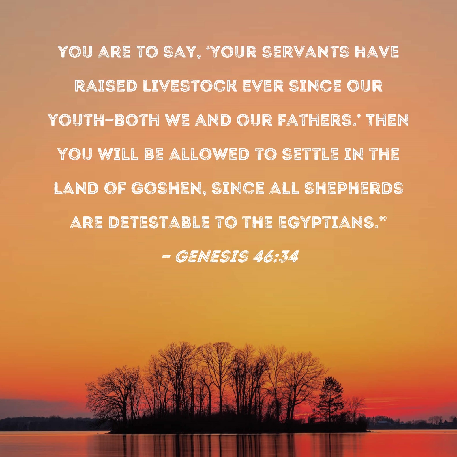 Genesis 46:34 you are to say, 'Your servants have raised livestock ever since our youth--both we and our fathers.' Then you will be allowed to settle in the land of Goshen, since all shepherds are detestable to the Egyptians."