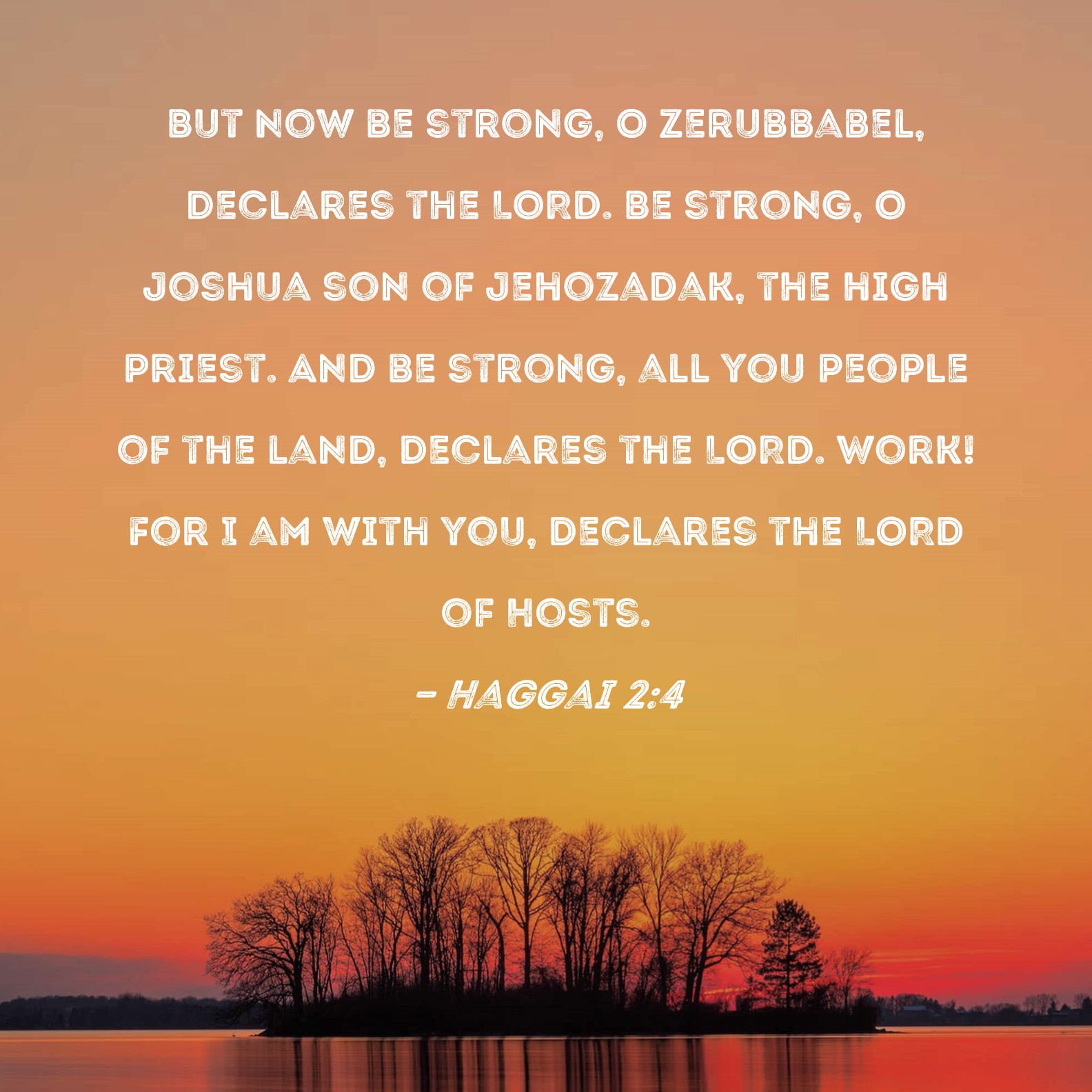 Haggai 2:4 But now be strong, O Zerubbabel, declares the LORD. Be strong, O Joshua son of Jehozadak, the high priest. And be strong, all you people of the land, declares the LORD. Work! For I am with you, declares the LORD of Hosts.