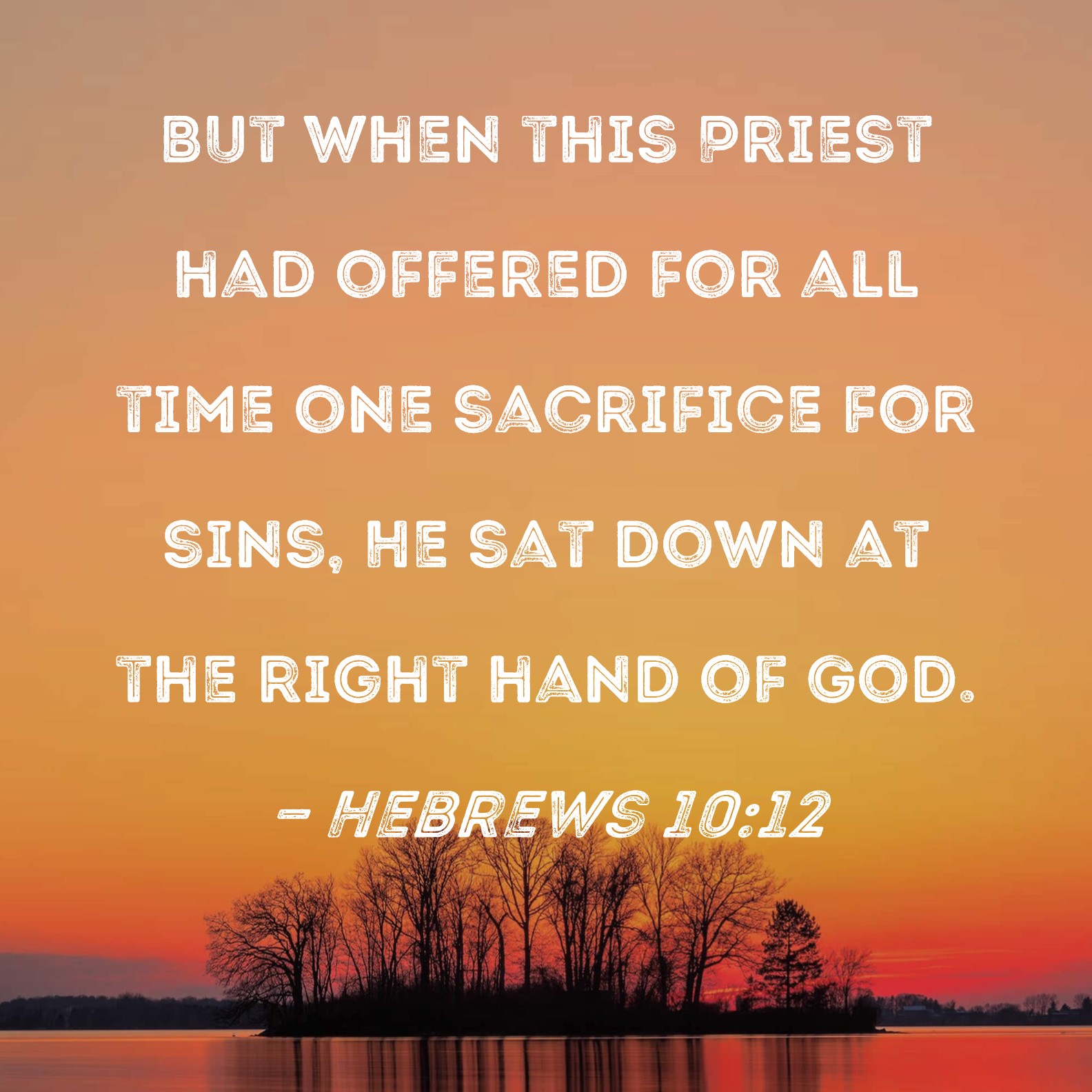 BSB: But when this Priest had offered for all time one sacrifice for sins, He sat down at the right hand of God. KJV: But this man, after he had offered one sacrifice for sins for ever, sat down on the right hand of God; DRB: But this man offering one sacrifice for sins, for ever sitteth on the right hand of God, DBT: But he, having offered one sacrifice for sins, sat down in perpetuity at the right hand of God, ERV: but he, when he had offered one sacrifice for sins for ever, sat down on the right hand of God; WBT: But this man, after he had offered one sacrifice for sins, for ever sat down on the right hand of God; WEB: but he, when he had offered one sacrifice for sins forever, sat down on the right hand of God, YLT: And He, for sin one sacrifice having offered — to the end, did sit down on the right hand of God, — Links Hebrews 10:12 NIV • Hebrews 10:12 NLT • Hebrews 10:12 ESV • Hebrews 10:12 NASB • Hebrews 10:12 KJV • Hebrews 10:12 Interlinear • Hebrews 10:12 Commentaries • Hebrews 10:12 Parallel Texts • Hebrews 10:12 Bible Apps • Hebrews 10:12 Parallel • Bible Hub |