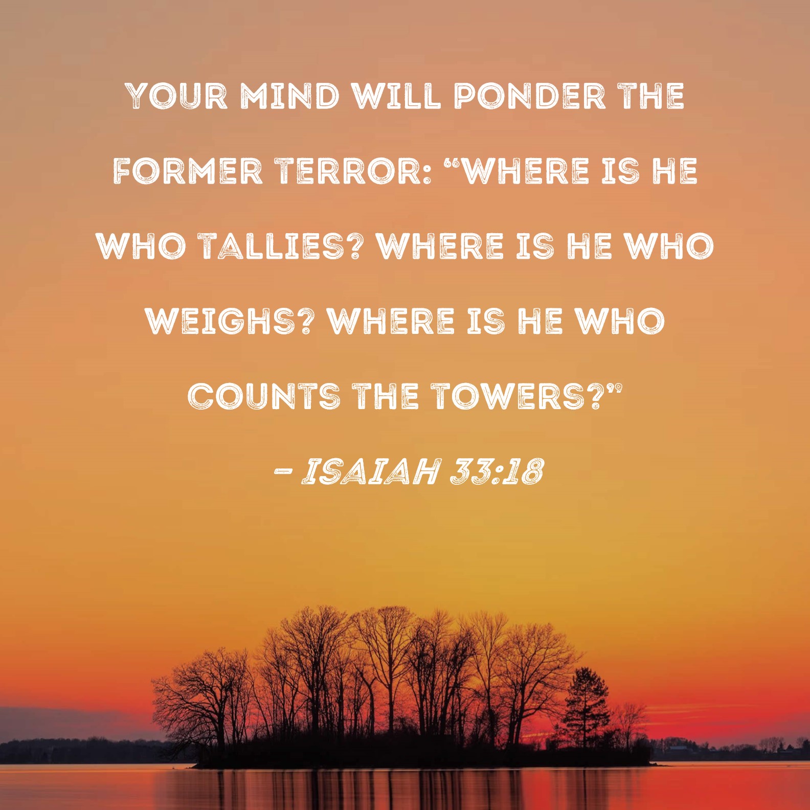 Isaiah 33:18 Your mind will ponder the former terror: "Where is he who tallies? Where is he who weighs? Where is he who counts the towers?"