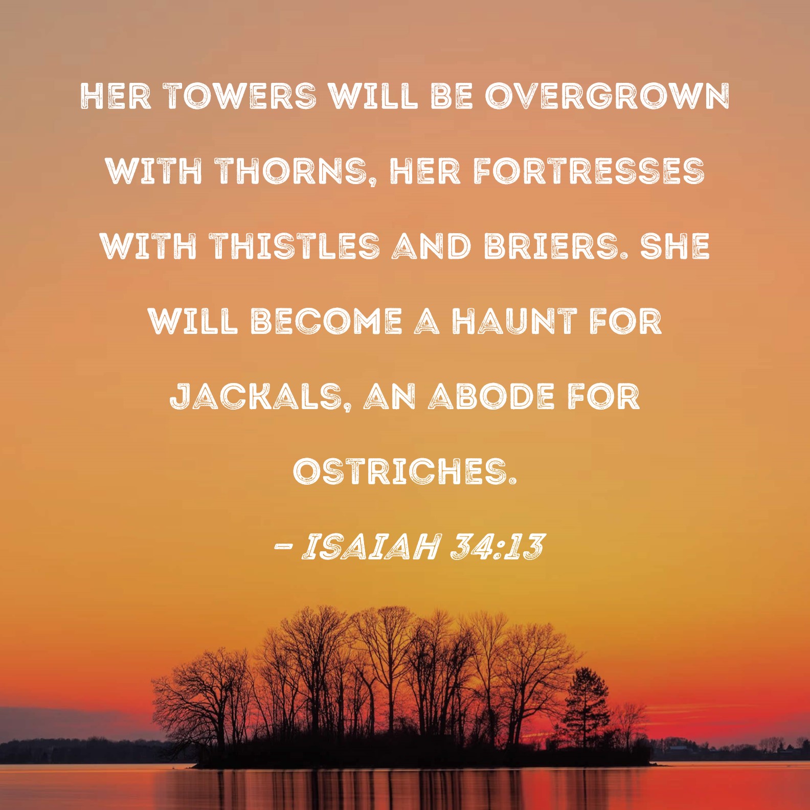 Isaiah 34:13 Her towers will be overgrown with thorns, her fortresses with thistles and briers. She will become a haunt for jackals, an abode for ostriches.