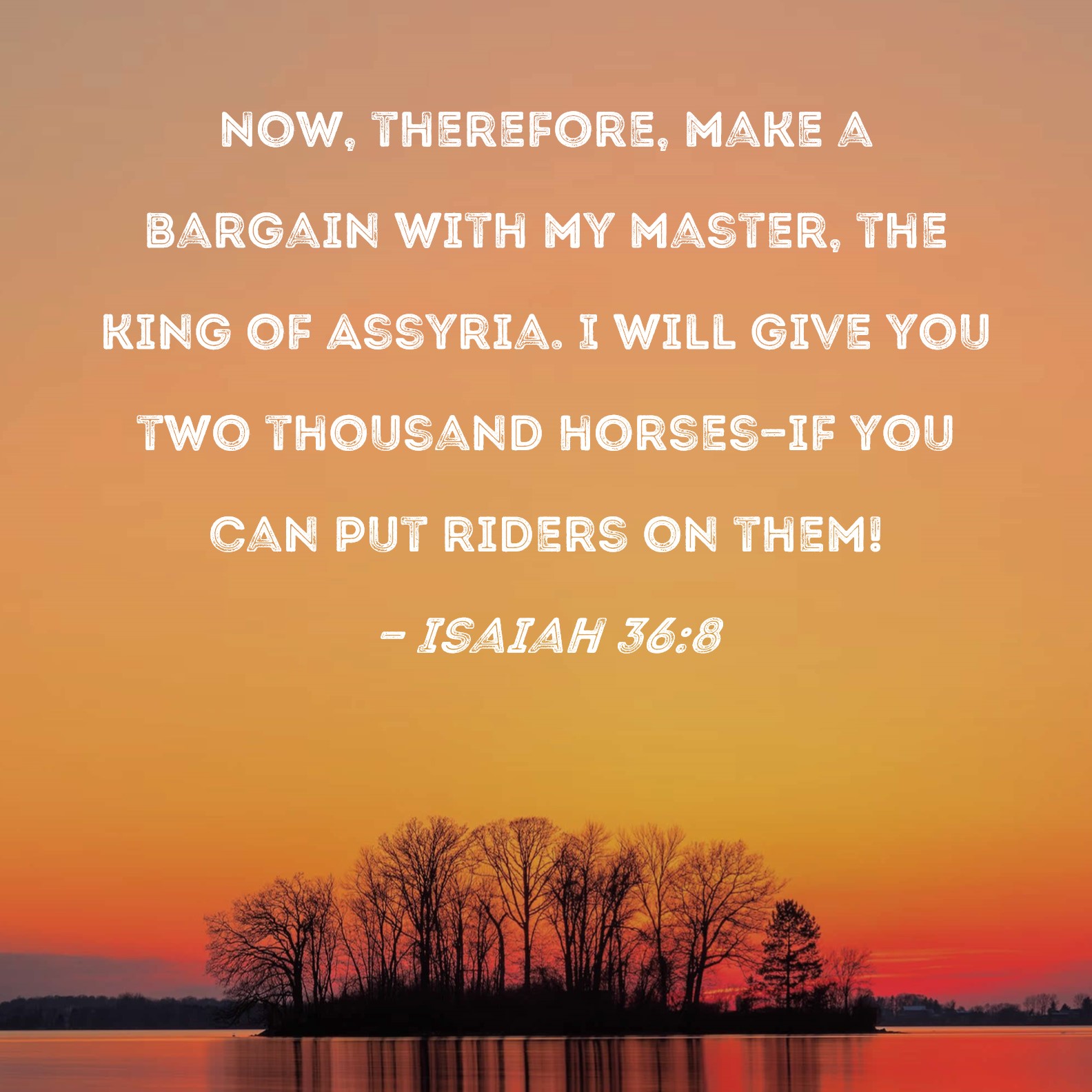 Isaiah 36:8 Now, therefore, make a bargain with my master, the king of Assyria. I will give you two thousand horses--if you can put riders on them!