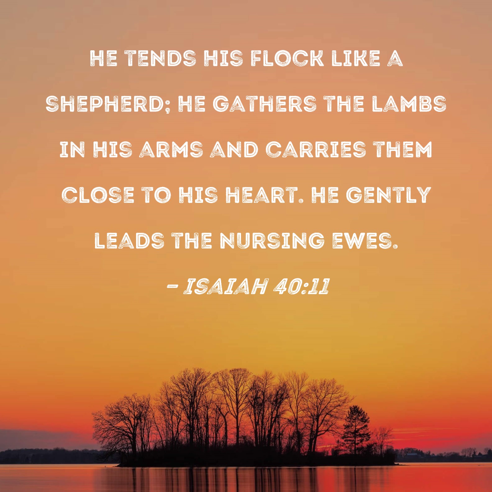 Isaiah 40:11 He tends His flock like a shepherd; He gathers the lambs in His arms and carries them close to His heart. He gently leads the nursing ewes.