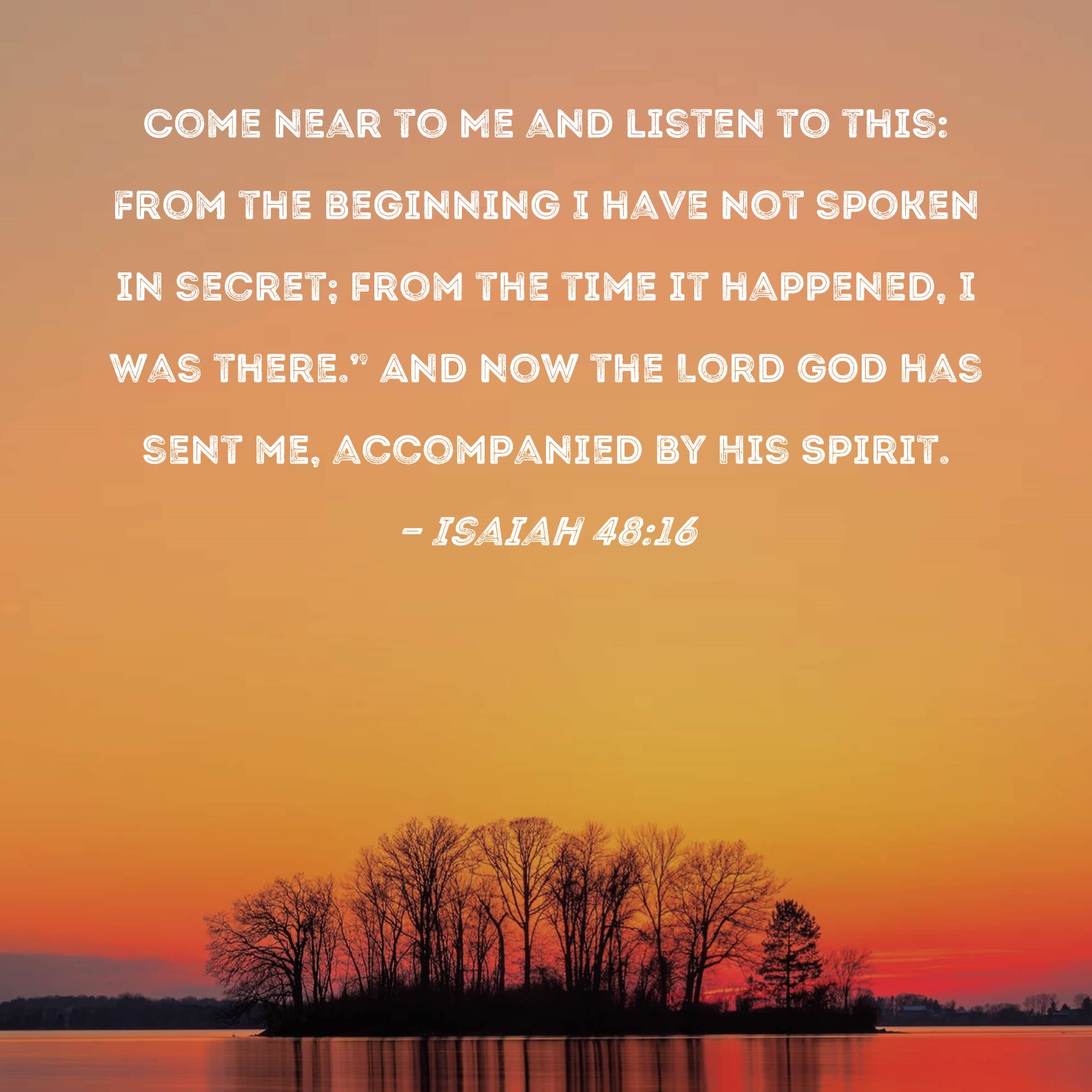 Isaiah 48:16 Come near to Me and listen to this: From the beginning I have not spoken in secret; from the time it happened, I was there." And now the Lord GOD has sent me, accompanied by His Spirit.
