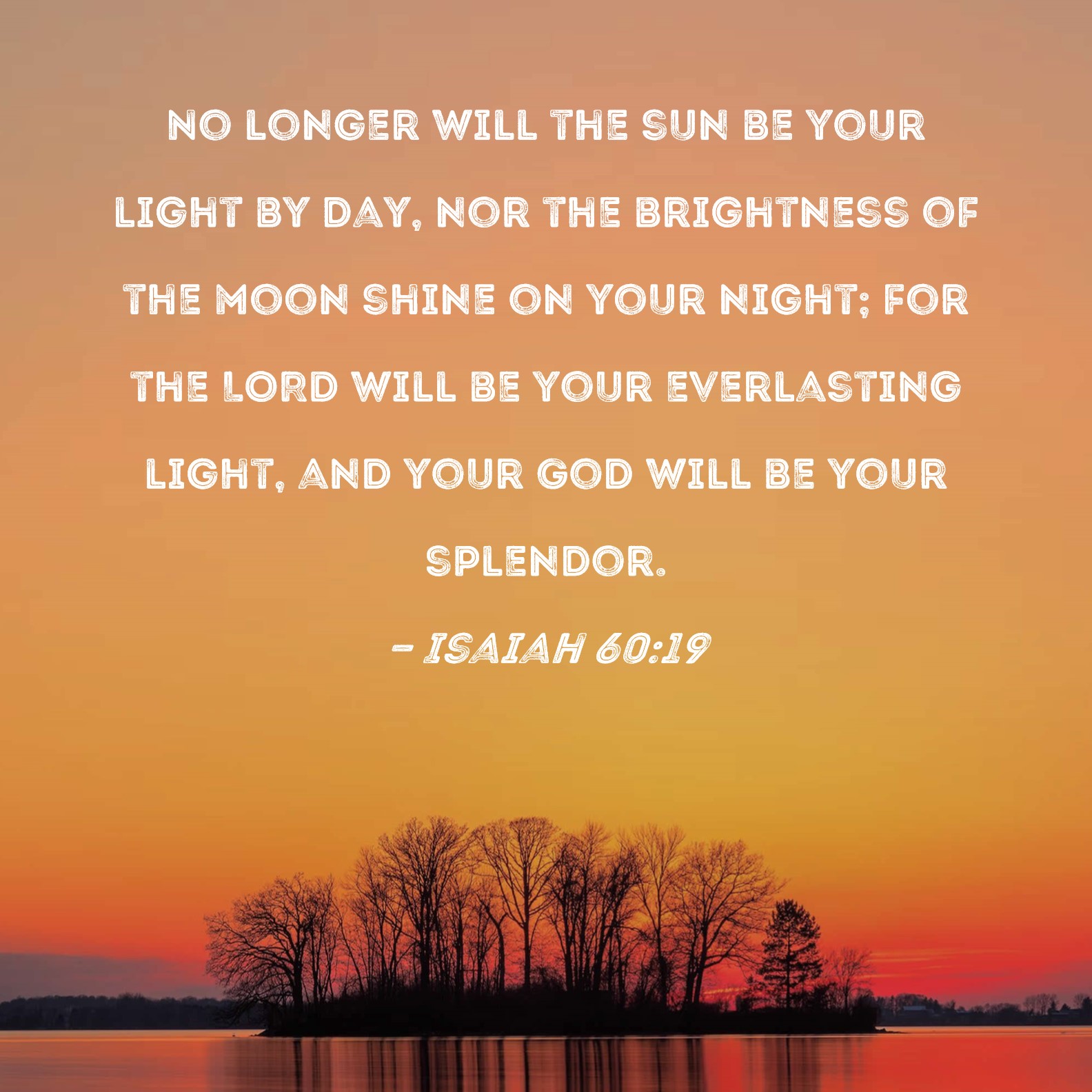 Isaiah 60:19 No longer will the sun be your light by day, nor the brightness of the moon shine on your night; for the LORD will be your everlasting light, and your God will be your splendor.