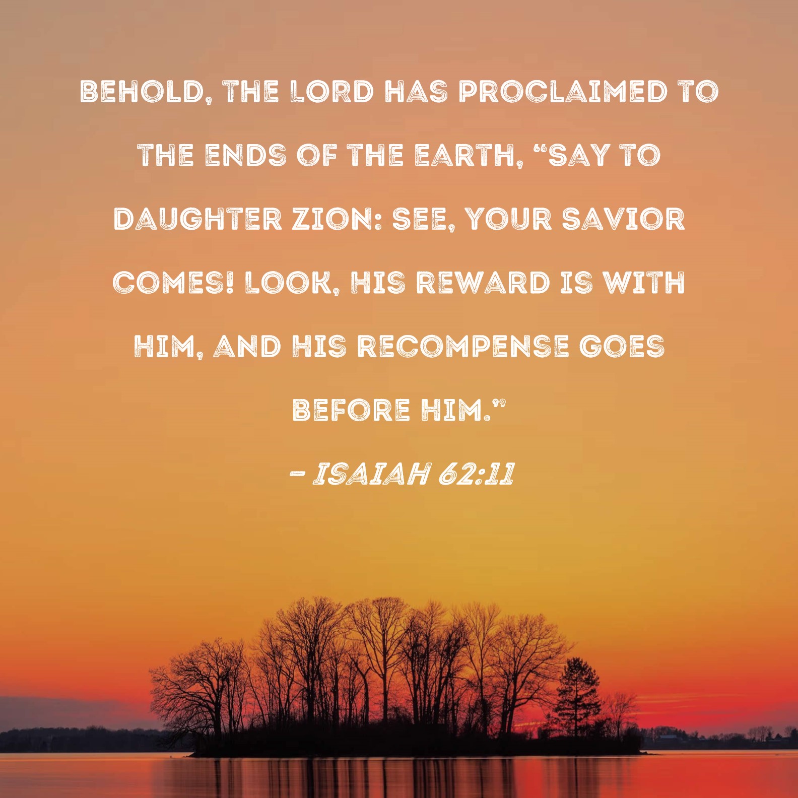Isaiah 62:11 Behold, the LORD has proclaimed to the ends of the earth, "Say to Daughter Zion: See, your Savior comes! Look, His reward is with Him, and His recompense goes before Him."
