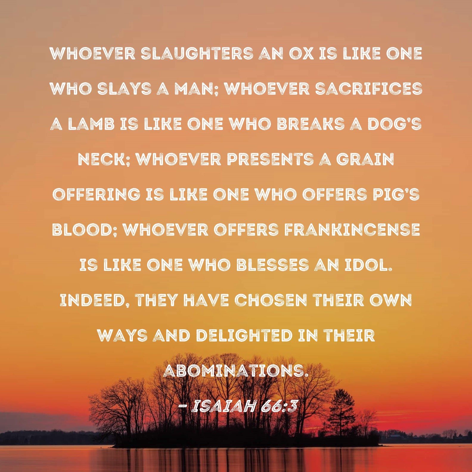 Isaiah 66:3 Whoever slaughters an ox is like one who slays a man; whoever sacrifices a lamb is like one who breaks a dog's neck; whoever presents a grain offering is like one who offers pig's blood; whoever offers frankincense is like one who blesses an idol. Indeed, they have chosen their own ways and delighted in their abominations.