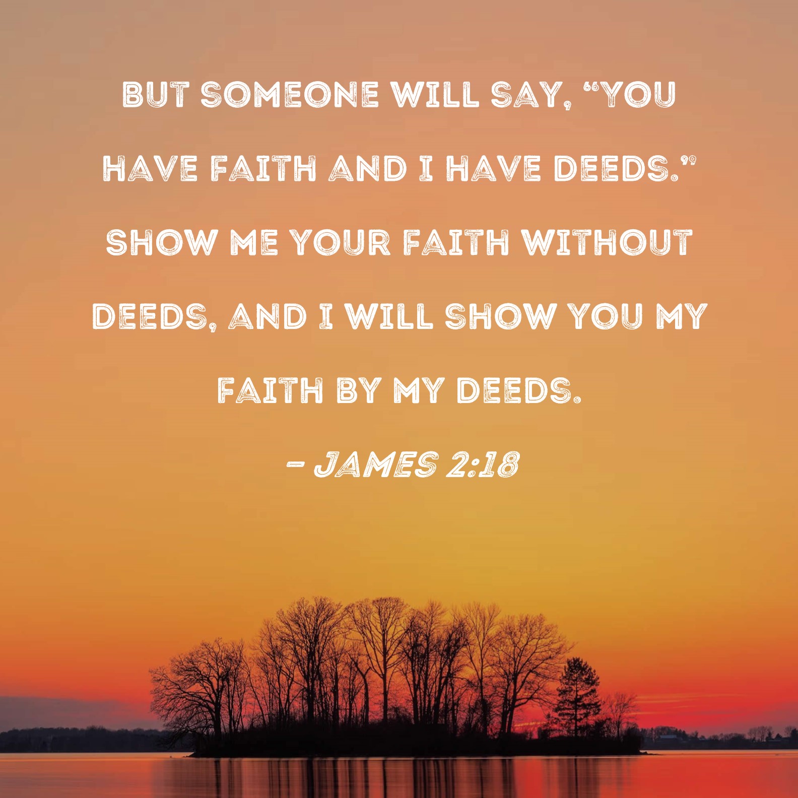 James 2:18 But someone will say, "You have faith and I have deeds." Show me your faith without deeds, and I will show you my faith by my deeds.