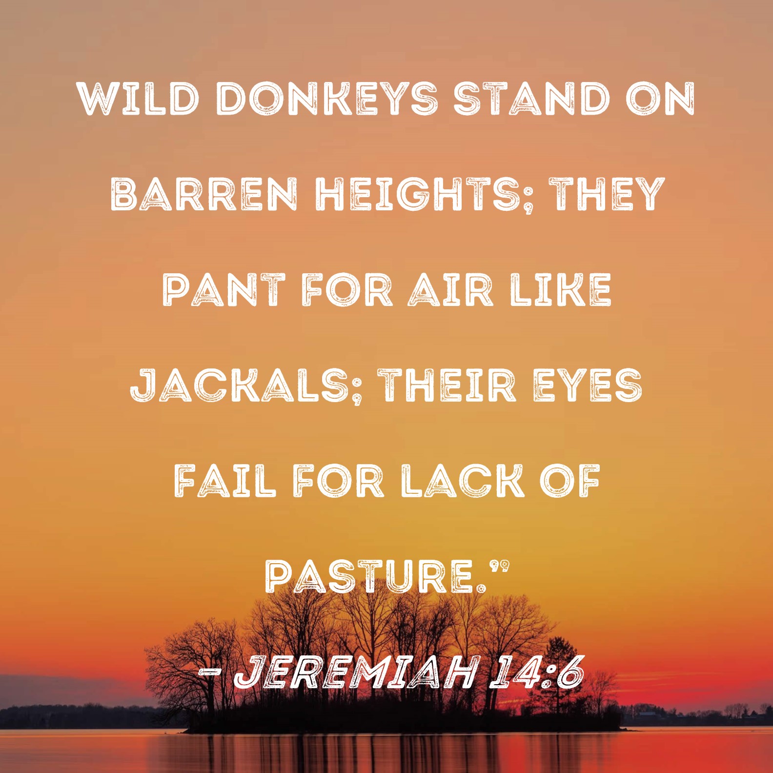 Jeremiah 14:6 Wild donkeys stand on barren heights; they pant for air like jackals; their eyes fail for lack of pasture."