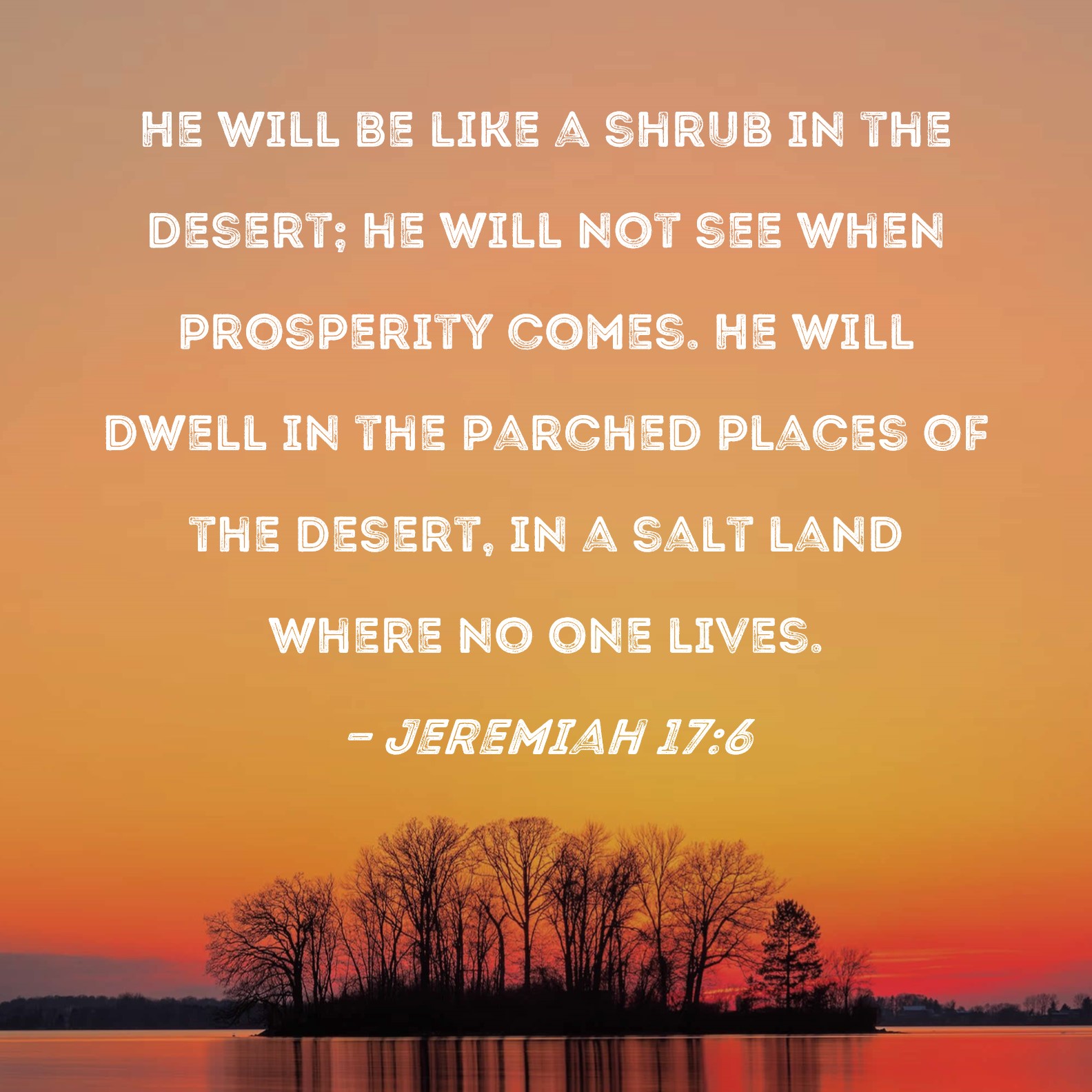 Jeremiah 17:6 He will be like a shrub in the desert; he will not see when prosperity comes. He will dwell in the parched places of the desert, in a salt land where no one lives.