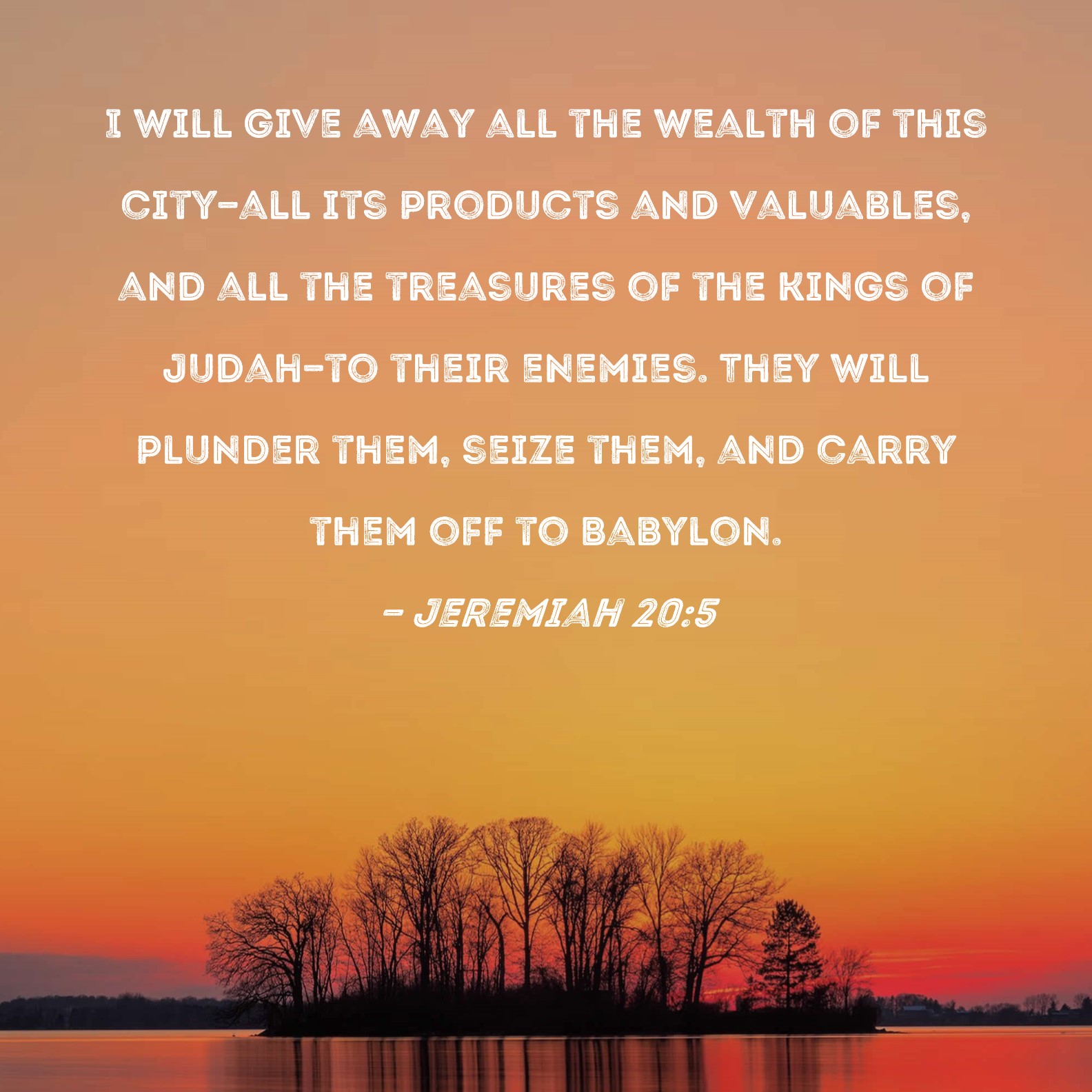 Jeremiah 20:5 I will give away all the wealth of this city--all its products and valuables, and all the treasures of the kings of Judah--to their enemies. They will plunder them, seize them, and carry them off to Babylon.