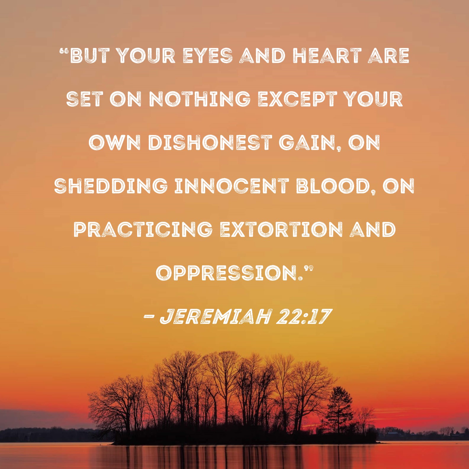 Jeremiah 22:17 "But your eyes and heart are set on nothing except your own dishonest gain, on shedding innocent blood, on practicing extortion and oppression."