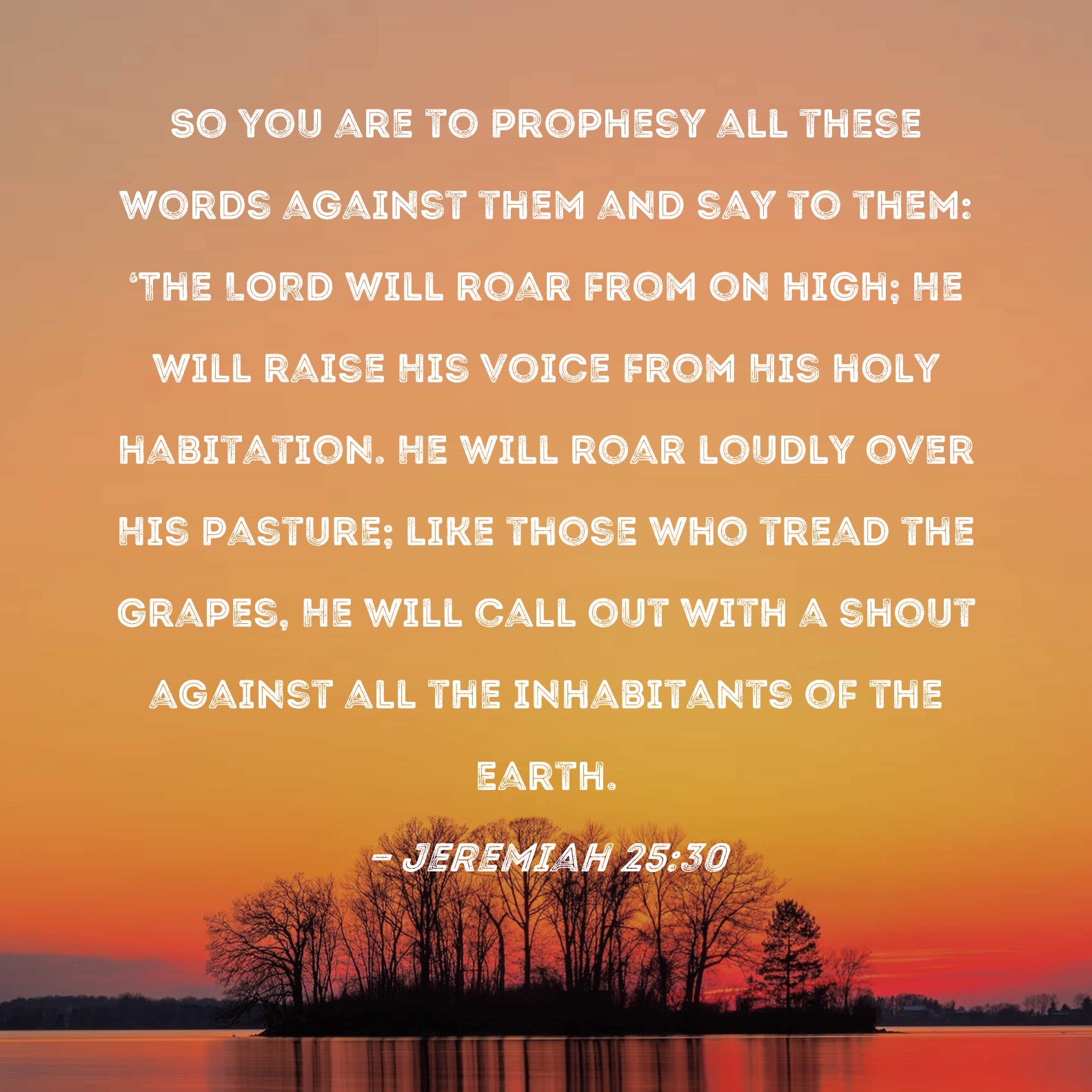 Jeremiah 25:30 So you are to prophesy all these words against them and say to them: 'The LORD will roar from on high; He will raise His voice from His holy habitation. He will roar loudly over His pasture; like those who tread the grapes, He will call out with a shout against all the inhabitants of the earth.