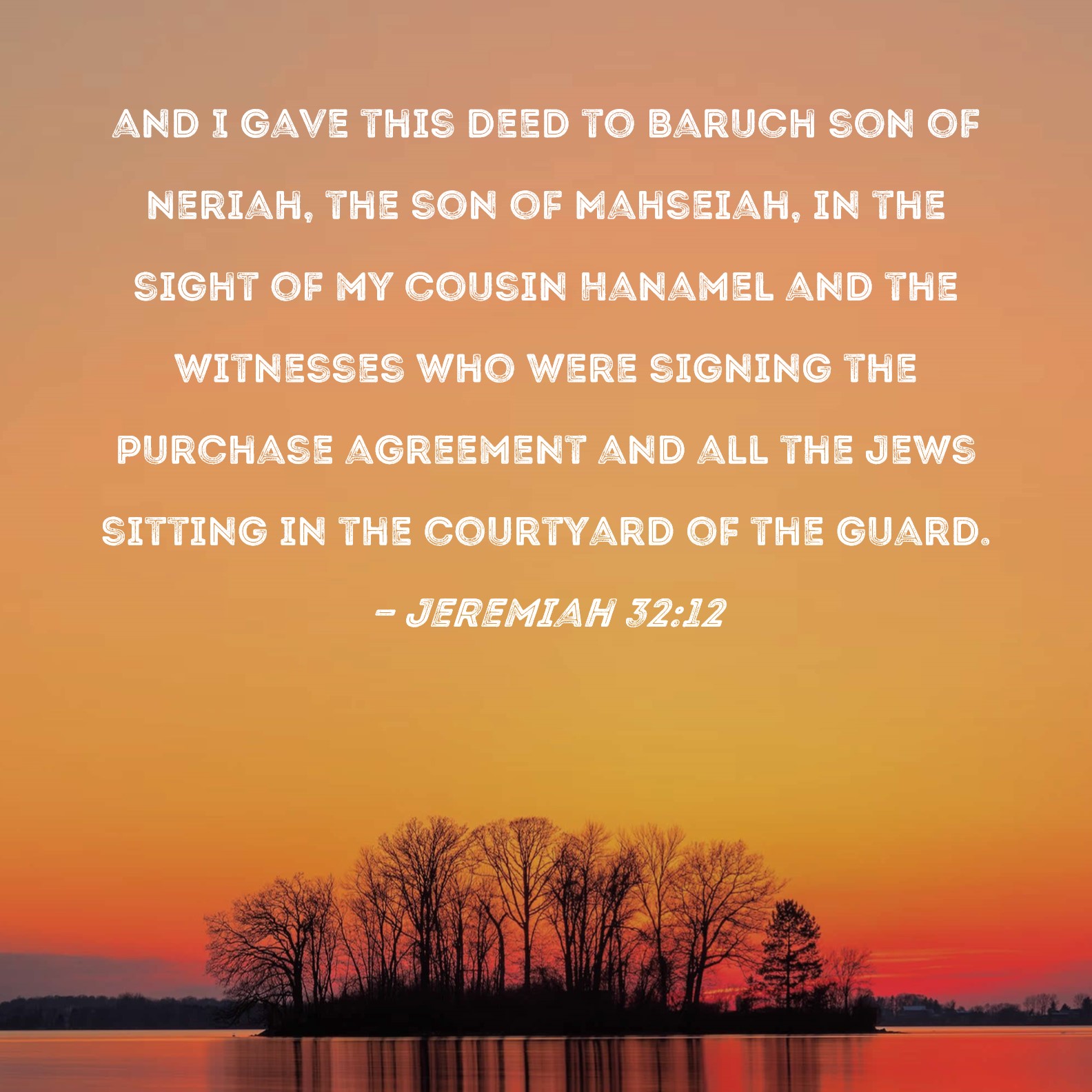 Jeremiah 32:12 and I gave this deed to Baruch son of Neriah, the son of Mahseiah, in the sight of my cousin Hanamel and the witnesses who were signing the purchase agreement and all the Jews sitting in the courtyard of the guard.