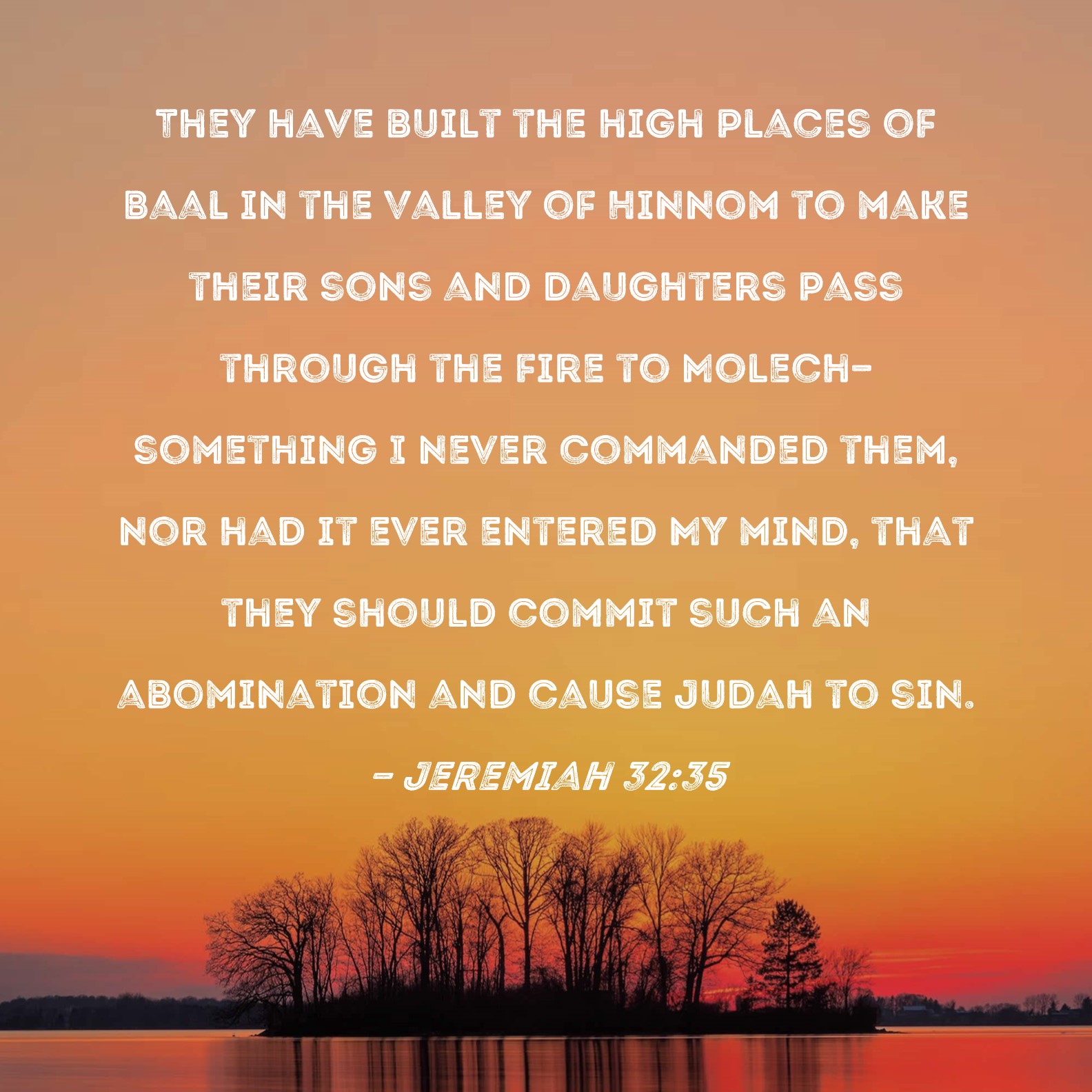 Jeremiah 32:35 They have built the high places of Baal in the Valley of Hinnom to make their sons and daughters pass through the fire to Molech--something I never commanded them, nor had it ever entered My mind, that they should commit such an abomination and cause Judah to sin.