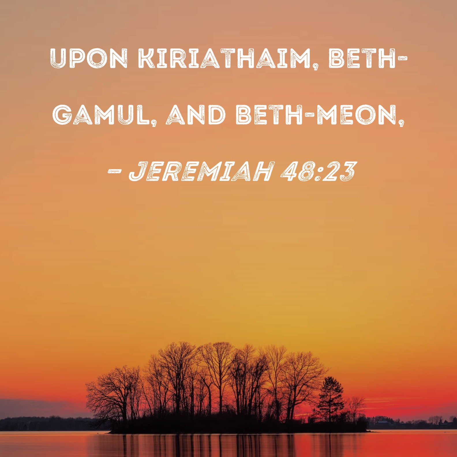 BSB: upon Kiriathaim, Beth-gamul, and Beth-meon, KJV: And upon Kiriathaim, and upon Bethgamul, and upon Bethmeon, DRB: And upon Cariathaim, and upon Bethgamul, and upon Bethmaon, DBT: and upon Kirjathaim, and upon Beth-gamul, and upon Beth-meon; ERV: and upon Kiriathaim, and upon Beth-gamul, and upon Beth-meon; WBT: And upon Kiriathaim, and upon Beth-gamul, and upon Beth-meon, WEB: on Kiriathaim, on Beth Gamul, on Beth Meon, YLT: And on Beth-Gamul, and on Beth-Meon,Links Jeremiah 48:23 NIV • Jeremiah 48:23 NLT • Jeremiah 48:23 ESV • Jeremiah 48:23 NASB • Jeremiah 48:23 KJV • Jeremiah 48:23 Interlinear • Jeremiah 48:23 Commentaries • Jeremiah 48:23 Parallel Texts • Jeremiah 48:23 Bible Apps • Jeremiah 48:23 Parallel • Bible Hub |