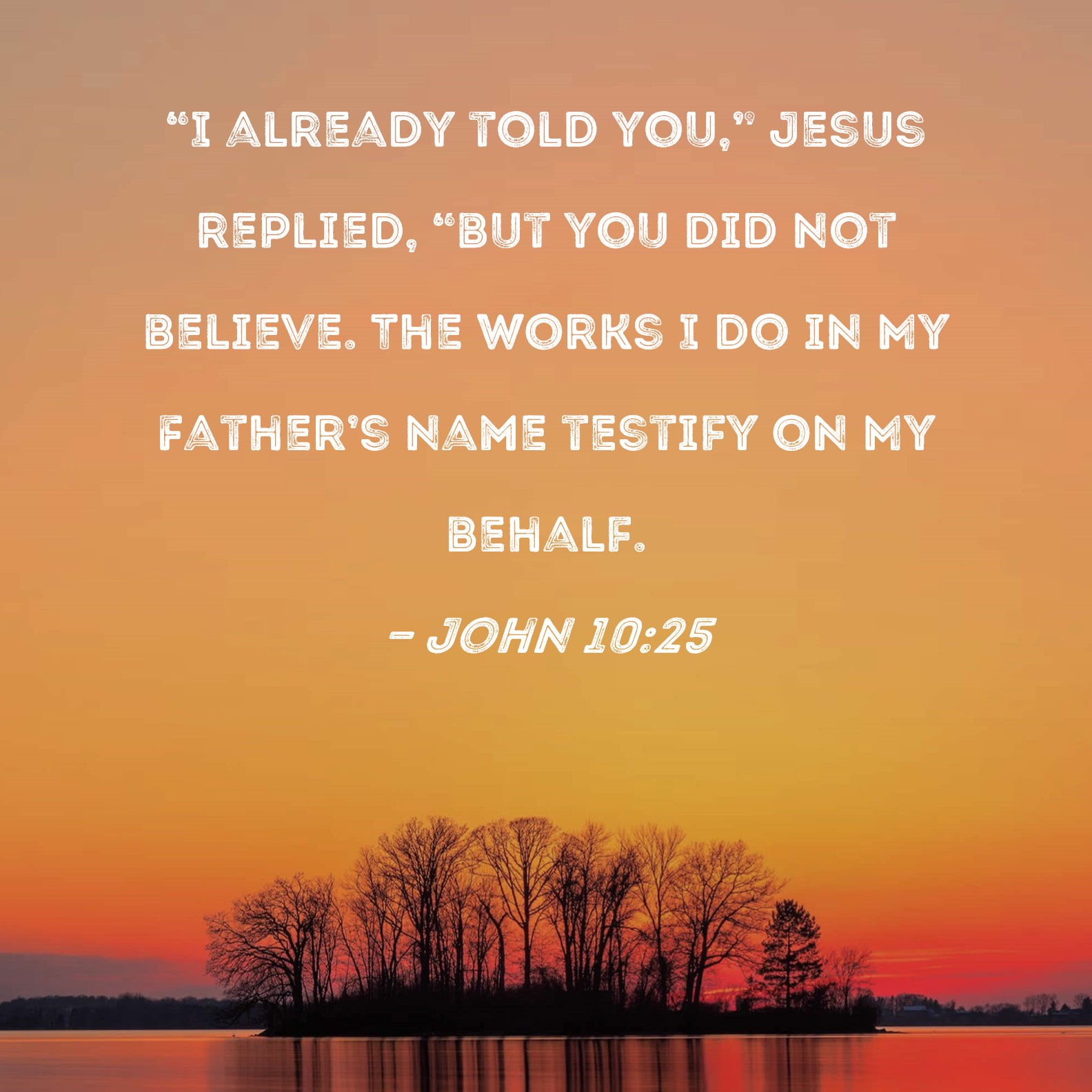 BSB: "I already told you," Jesus replied, "but you did not believe. The works I do in My Father's name testify on My behalf. KJV: Jesus answered them, I told you, and ye believed not: the works that I do in my Father's name, they bear witness of me. DRB: Jesus answered them: I speak to you, and you believe not: the works that I do in the name of my Father, they give testimony of me. DBT: Jesus answered them, I told you, and ye do not believe. The works which I do in my Father's name, these bear witness concerning me: ERV: Jesus answered them, I told you, and ye believe not: the works that I do in my Father's name, these bear witness of me. WBT: Jesus answered them, I told you, and ye believed not: the works that I did in my Father's name, they testify concerning me. WEB: Jesus answered them, “I told you, and you don’t believe. The works that I do in my Father’s name, these testify about me. YLT: Jesus answered them, 'I told you, and ye do not believe; the works that I do in the name of my Father, these testify concerning me;Links John 10:25 NIV • John 10:25 NLT • John 10:25 ESV • John 10:25 NASB • John 10:25 KJV • John 10:25 Interlinear • John 10:25 Commentaries • John 10:25 Parallel Texts • John 10:25 Bible Apps • John 10:25 Parallel • Bible Hub |