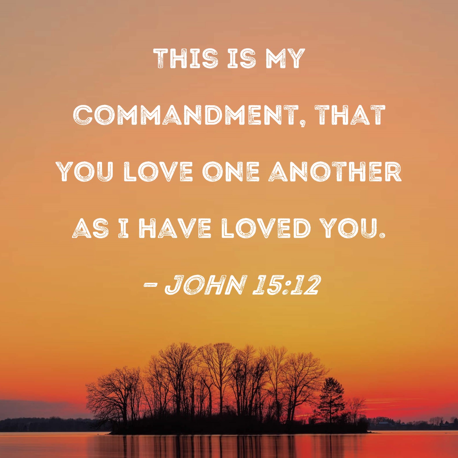 BSB: This is My commandment, that you love one another as I have loved you. KJV: This is my commandment, That ye love one another, as I have loved you. DRB: This is my commandment, that you love one another, as I have loved you. DBT: This is my commandment, that ye love one another, as I have loved you. ERV: This is my commandment, that ye love one another, even as I have loved you. WBT: This is my commandment, That ye love one another, as I have loved you. WEB: “This is my commandment, that you love one another, even as I have loved you. YLT: 'This is my command, that ye love one another, according as I did love you;Links John 15:12 NIV • John 15:12 NLT • John 15:12 ESV • John 15:12 NASB • John 15:12 KJV • John 15:12 Interlinear • John 15:12 Commentaries • John 15:12 Parallel Texts • John 15:12 Bible Apps • John 15:12 Parallel • Bible Hub |