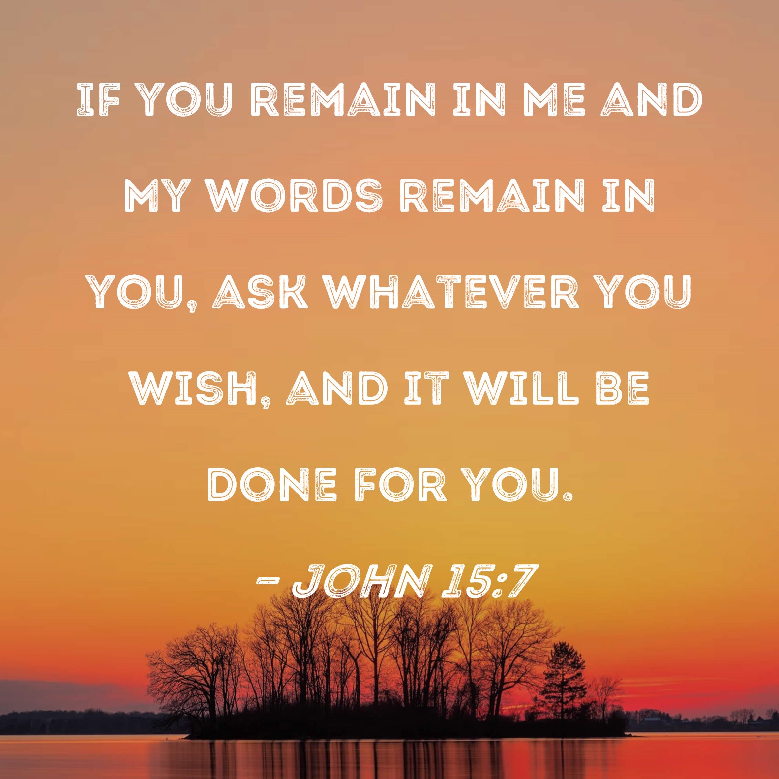 BSB: If you remain in Me and My words remain in you, ask whatever you wish, and it will be done for you. KJV: If ye abide in me, and my words abide in you, ye shall ask what ye will, and it shall be done unto you. DRB: If you abide in me, and my words abide in you, you shall ask whatever you will, and it shall be done unto you. DBT: If ye abide in me, and my words abide in you, ye shall ask what ye will and it shall come to pass to you. ERV: If ye abide in me, and my words abide in you, ask whatsoever ye will, and it shall be done unto you. WBT: If ye abide in me, and my words abide in you, ye may ask what ye will, and it shall be done to you. WEB: If you remain in me, and my words remain in you, you will ask whatever you desire, and it will be done for you. YLT: if ye may remain in me, and my sayings in you may remain, whatever ye may wish ye shall ask, and it shall be done to you.Links John 15:7 NIV • John 15:7 NLT • John 15:7 ESV • John 15:7 NASB • John 15:7 KJV • John 15:7 Interlinear • John 15:7 Commentaries • John 15:7 Parallel Texts • John 15:7 Bible Apps • John 15:7 Parallel • Bible Hub |