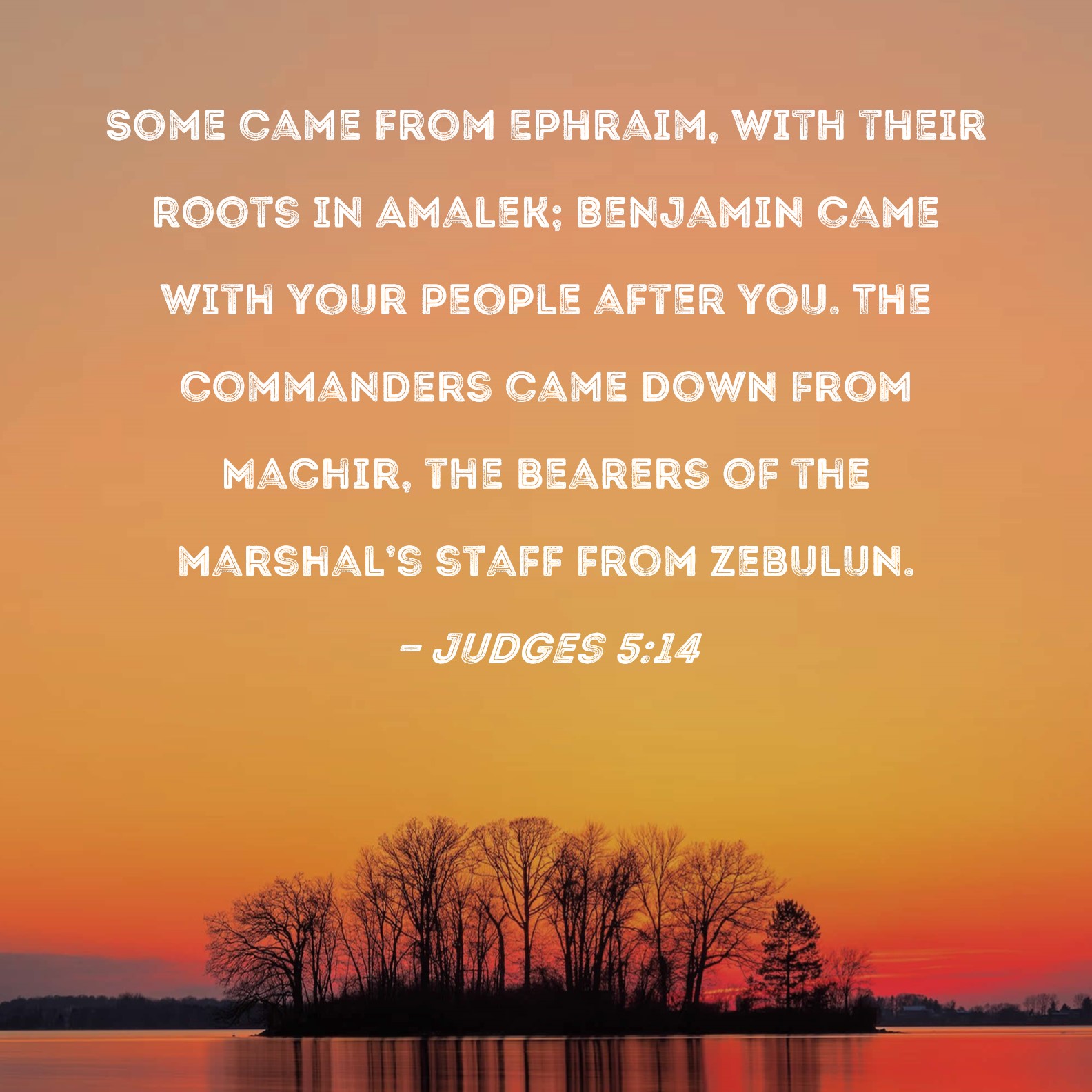 Judges 5:14 Some came from Ephraim, with their roots in Amalek; Benjamin came with your people after you. The commanders came down from Machir, the bearers of the marshal's staff from Zebulun.