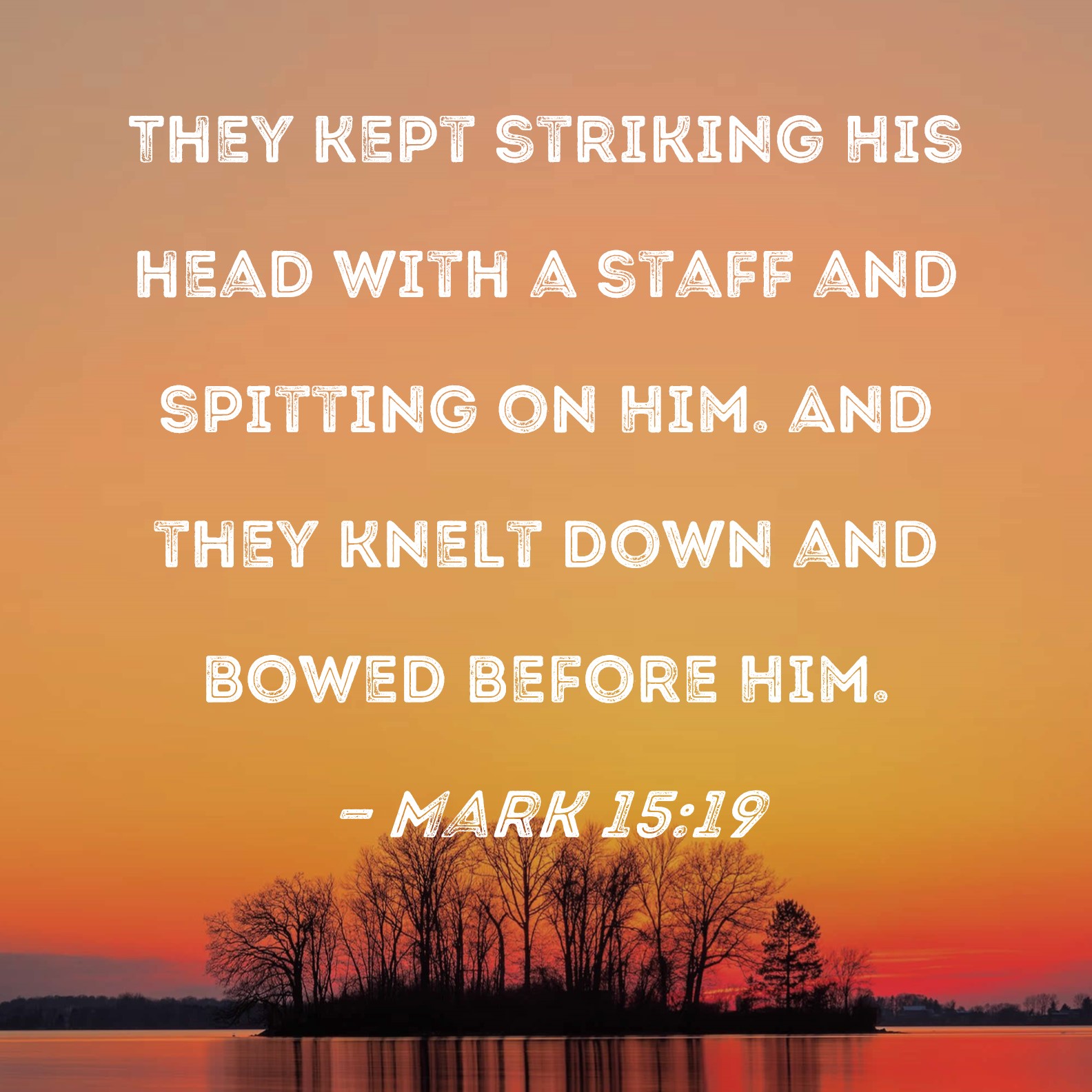 Mark 15:19 They kept striking His head with a staff and spitting on Him. And they knelt down and bowed before Him.