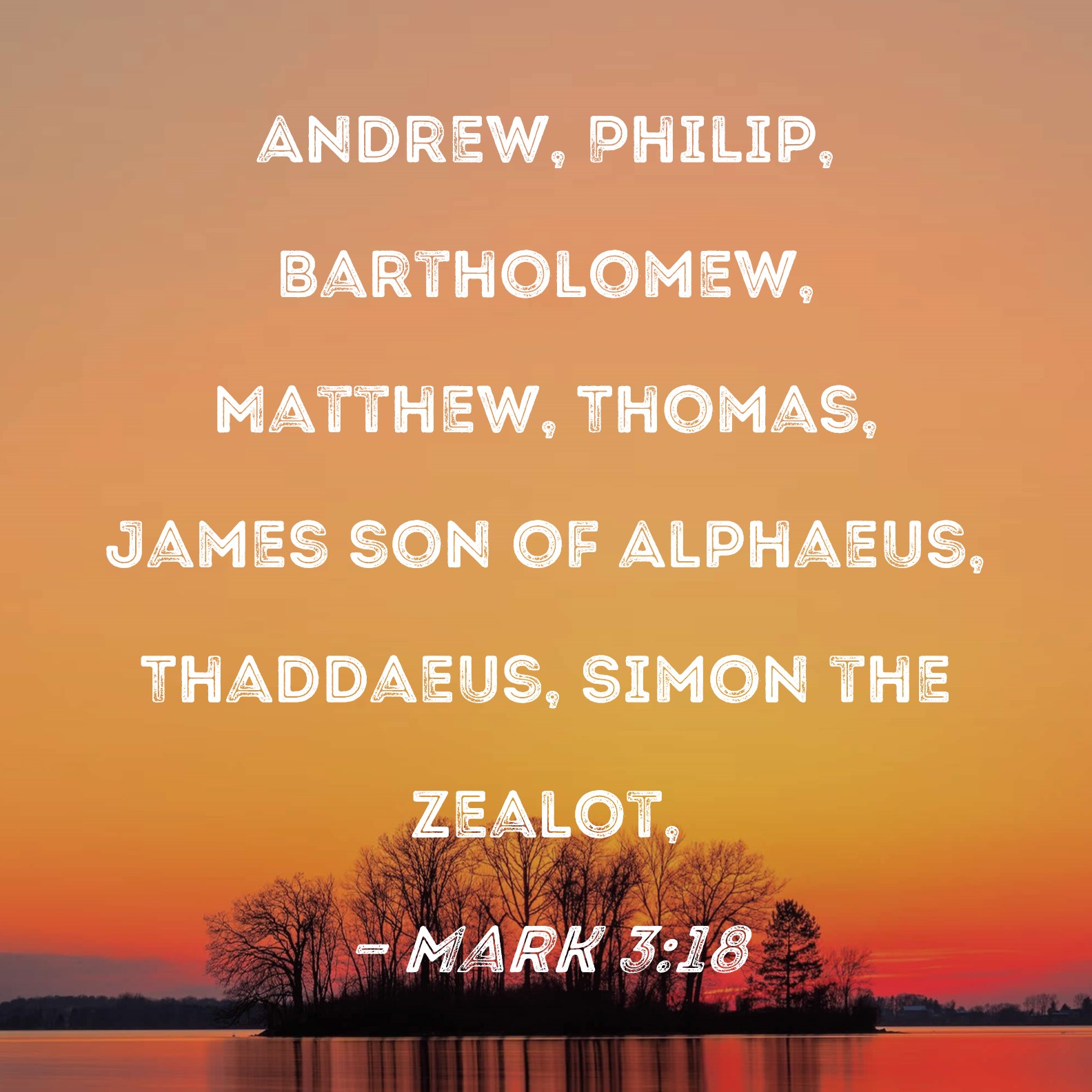 BSB: Andrew, Philip, Bartholomew, Matthew, Thomas, James son of Alphaeus, Thaddaeus, Simon the Zealot, KJV: And Andrew, and Philip, and Bartholomew, and Matthew, and Thomas, and James the son of Alphaeus, and Thaddaeus, and Simon the Canaanite, DRB: And Andrew and Philip, and Bartholomew and Matthew, and Thomas and James of Alpheus, and Thaddeus, and Simon the Cananean: DBT: and Andrew, and Philip, and Bartholomew, and Matthew, and Thomas, and James the son of Alphaeus, and Thaddaeus, and Simon the Cananaean, ERV: and Andrew, and Philip, and Bartholomew, and Matthew, and Thomas, and James the son of Alphaeus, and Thaddaeus, and Simon the Cananaean, WBT: And Andrew, and Philip, and Bartholomew, and Matthew, and Thomas, and James the son of Alpheus, and Thaddeus, and Simon the Canaanite, WEB: Andrew; Philip; Bartholomew; Matthew; Thomas; James, the son of Alphaeus; Thaddaeus; Simon the Zealot; YLT: and Andrew, and Philip, and Bartholomew, and Matthew, and Thomas, and James of Alpheus, and Thaddeus, and Simon the Cananite,Links Mark 3:18 NIV • Mark 3:18 NLT • Mark 3:18 ESV • Mark 3:18 NASB • Mark 3:18 KJV • Mark 3:18 Interlinear • Mark 3:18 Commentaries • Mark 3:18 Parallel Texts • Mark 3:18 Bible Apps • Mark 3:18 Parallel • Bible Hub |
