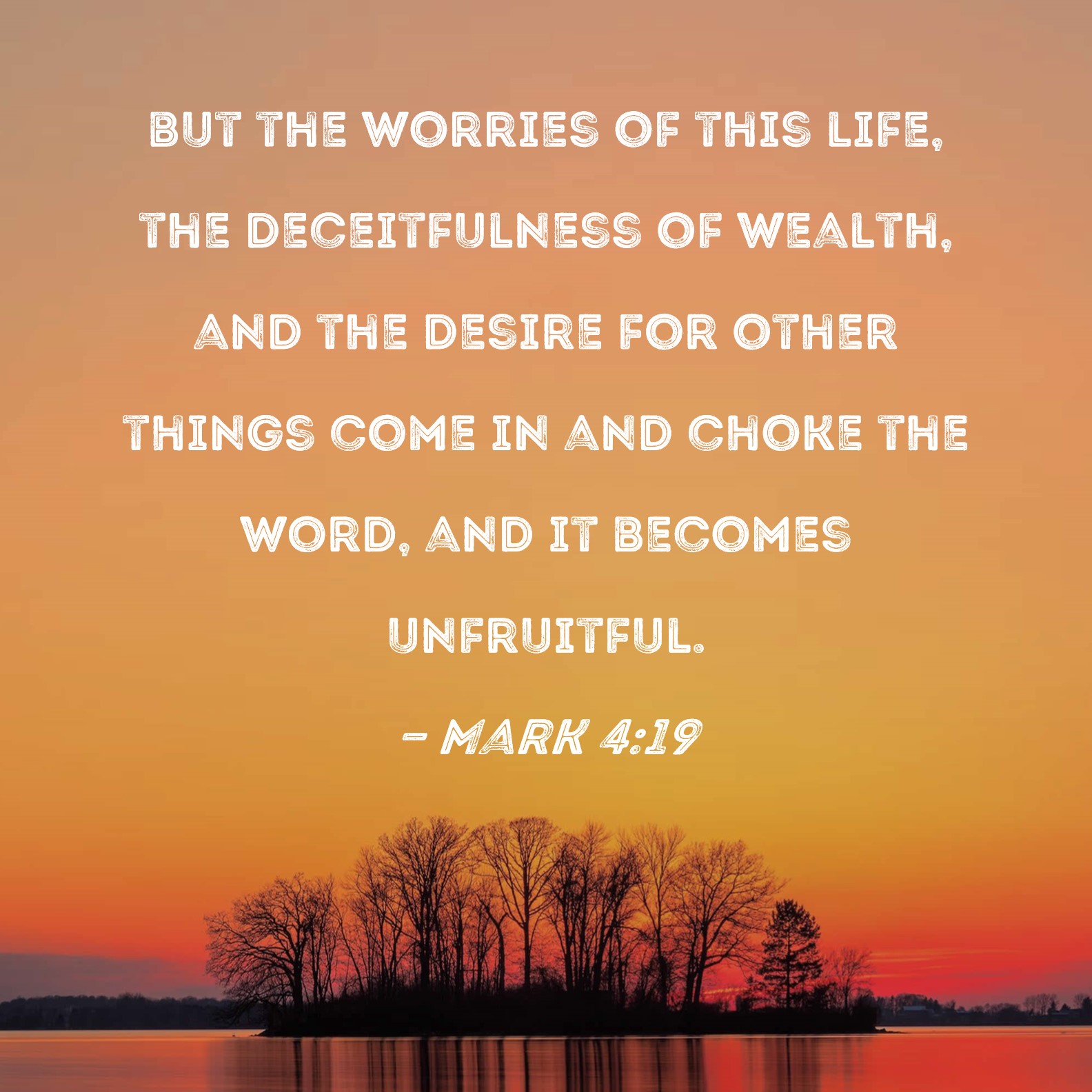Mark 4:19 but the worries of this life, the deceitfulness of wealth, and the desire for other things come in and choke the word, and it becomes unfruitful.