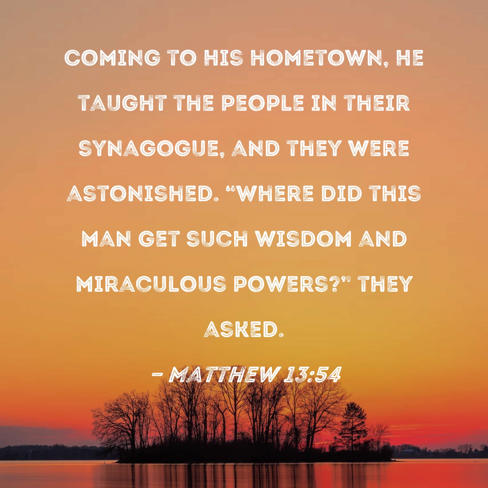 Matthew 13:54 Coming to His hometown, He taught the people in their synagogue, and they were astonished. "Where did this man get such wisdom and miraculous powers?" they asked.