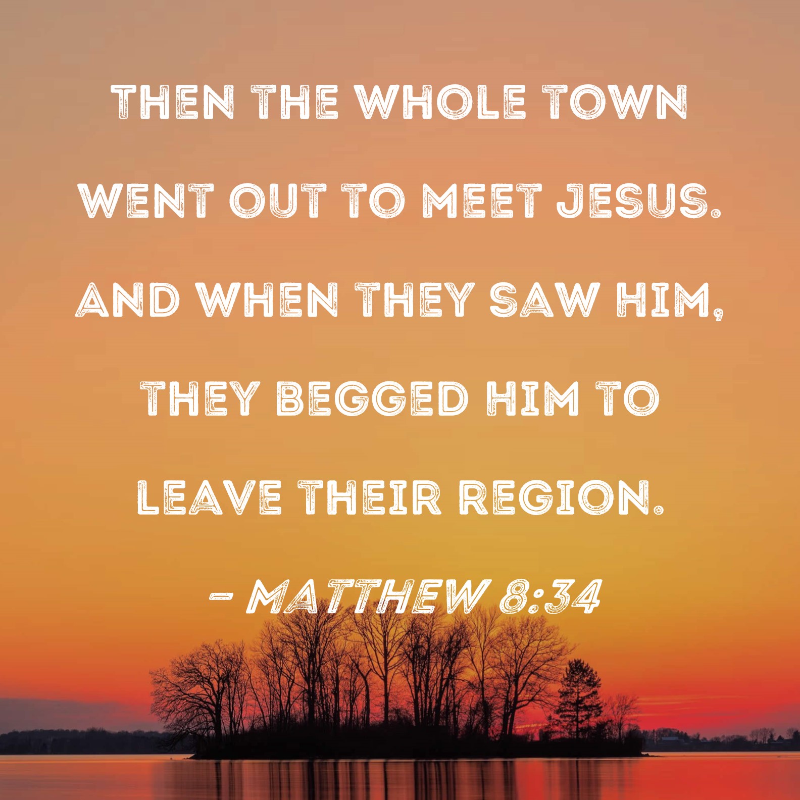 Matthew 8:34 Then the whole town went out to meet Jesus. And when they saw Him, they begged Him to leave their region.