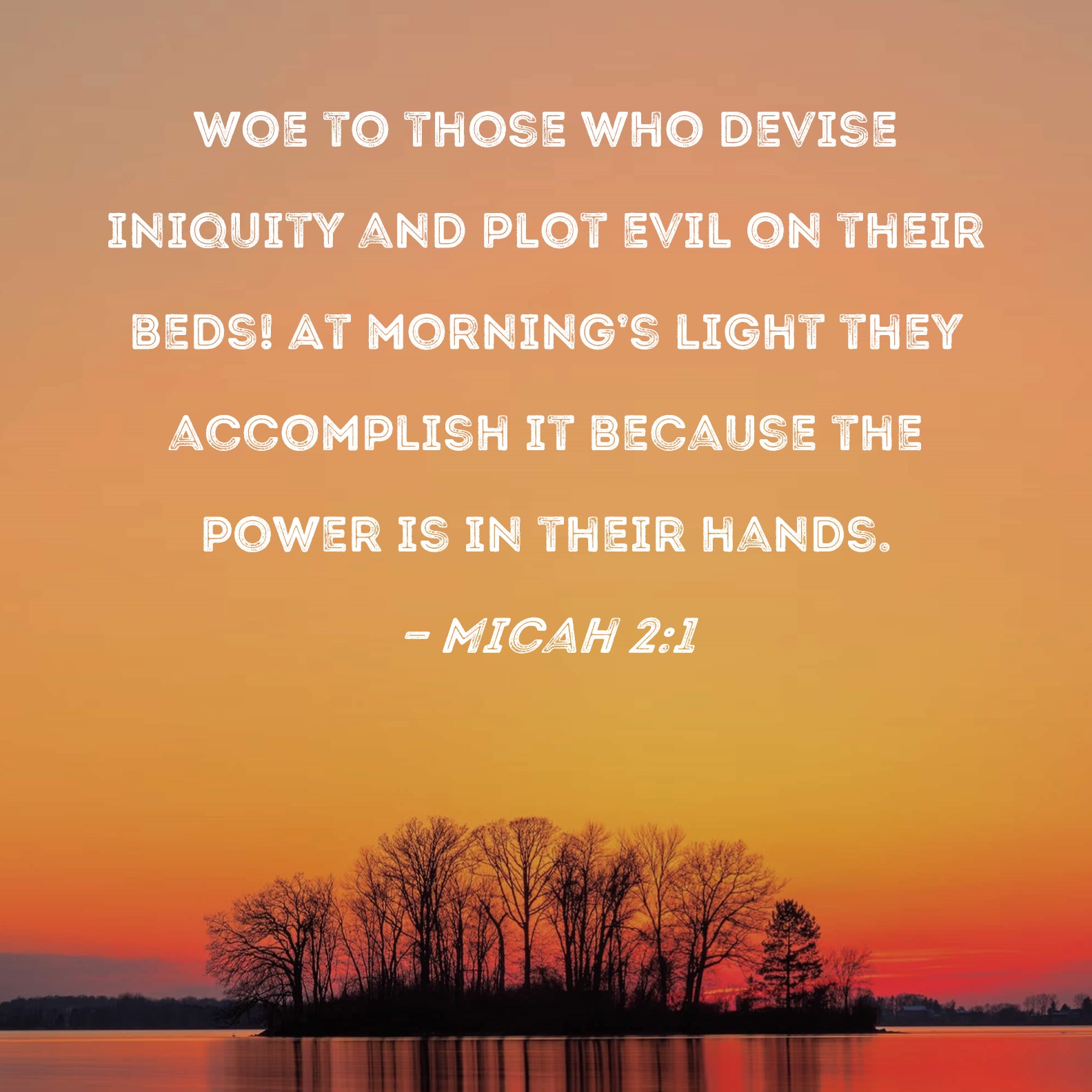 Micah 2:1 Woe to those who devise iniquity and plot evil on their beds! At morning's light they accomplish it because the power is in their hands.
