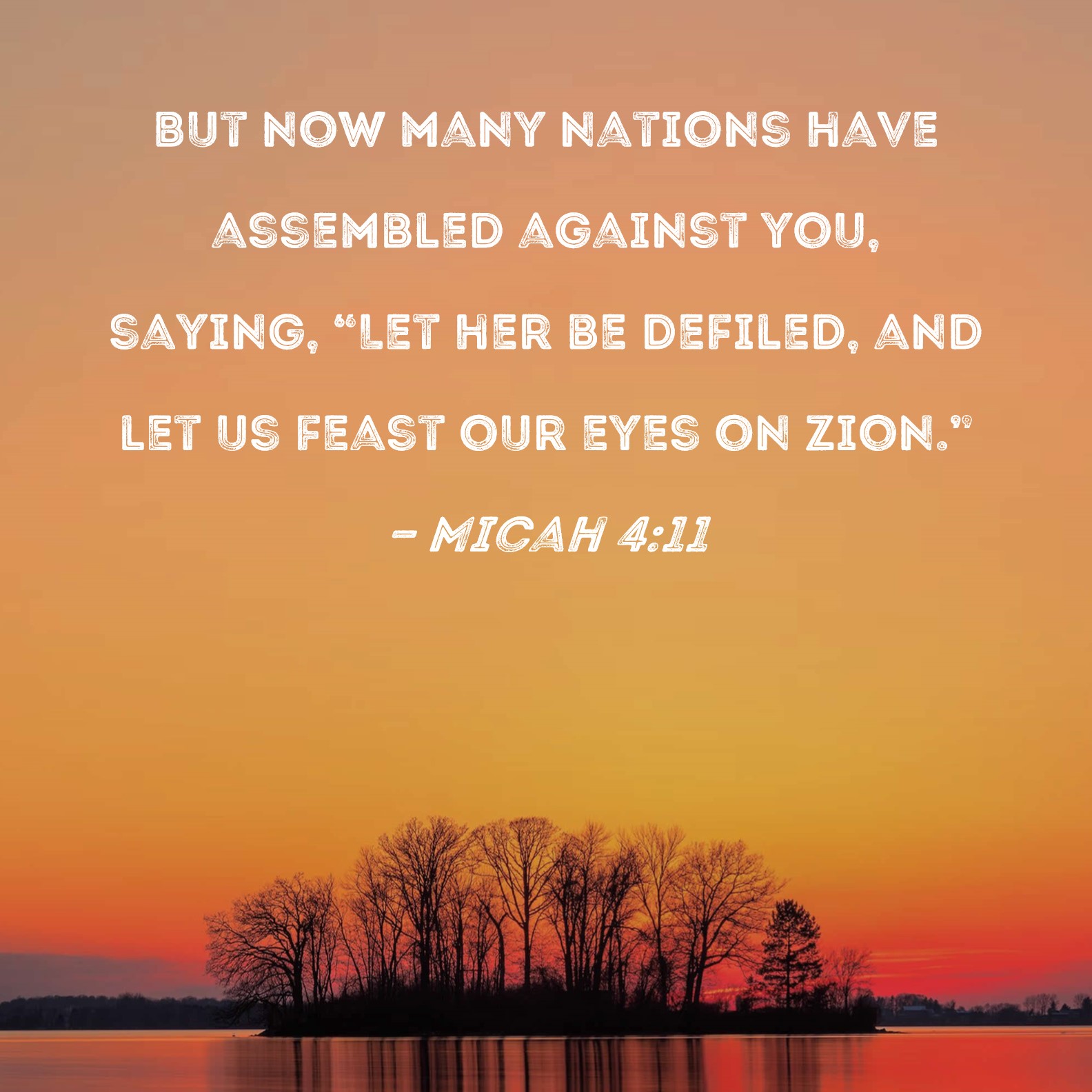 Micah 4:11 But now many nations have assembled against you, saying, "Let her be defiled, and let us feast our eyes on Zion."