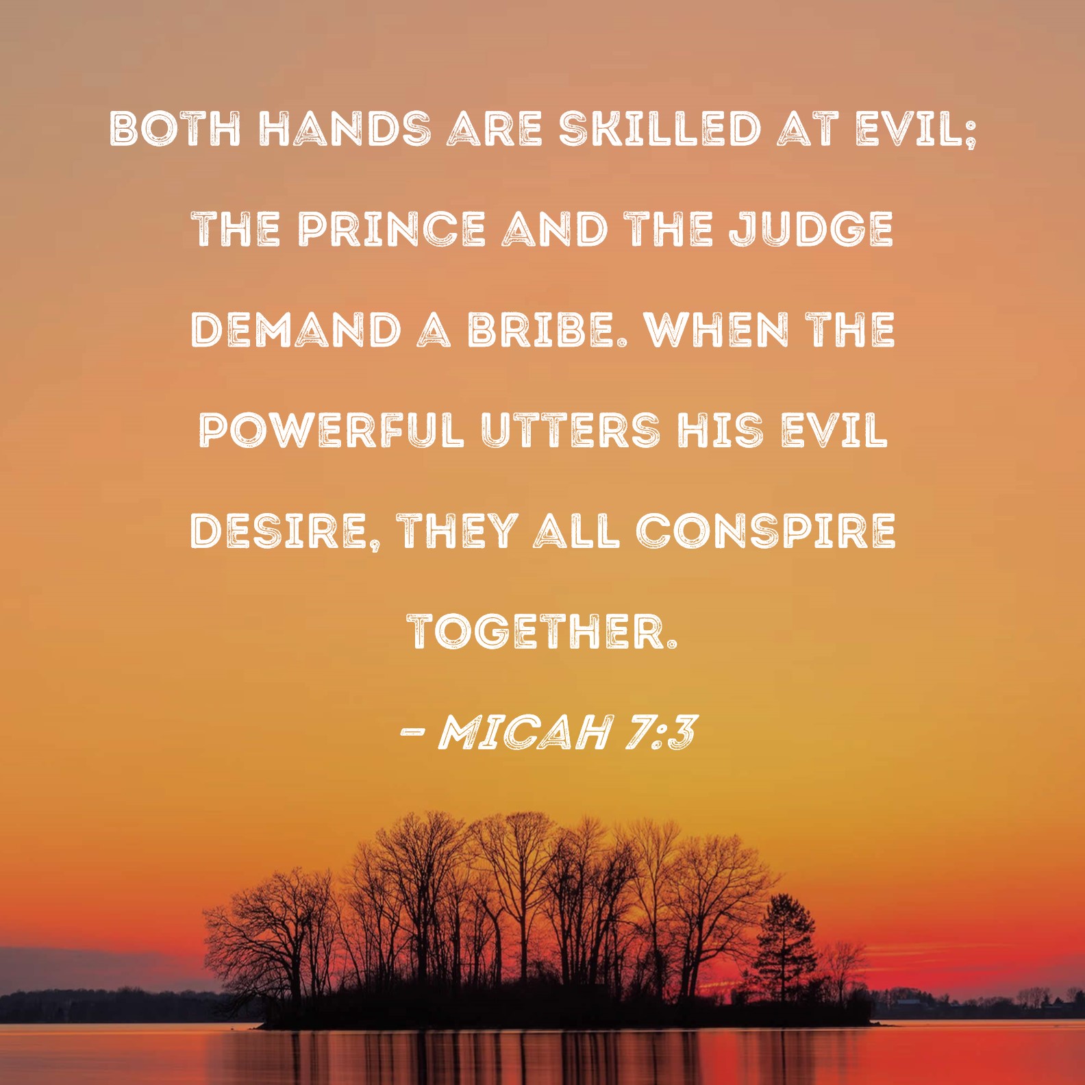 Micah 7:3 Both hands are skilled at evil; the prince and the judge demand a bribe. When the powerful utters his evil desire, they all conspire together.