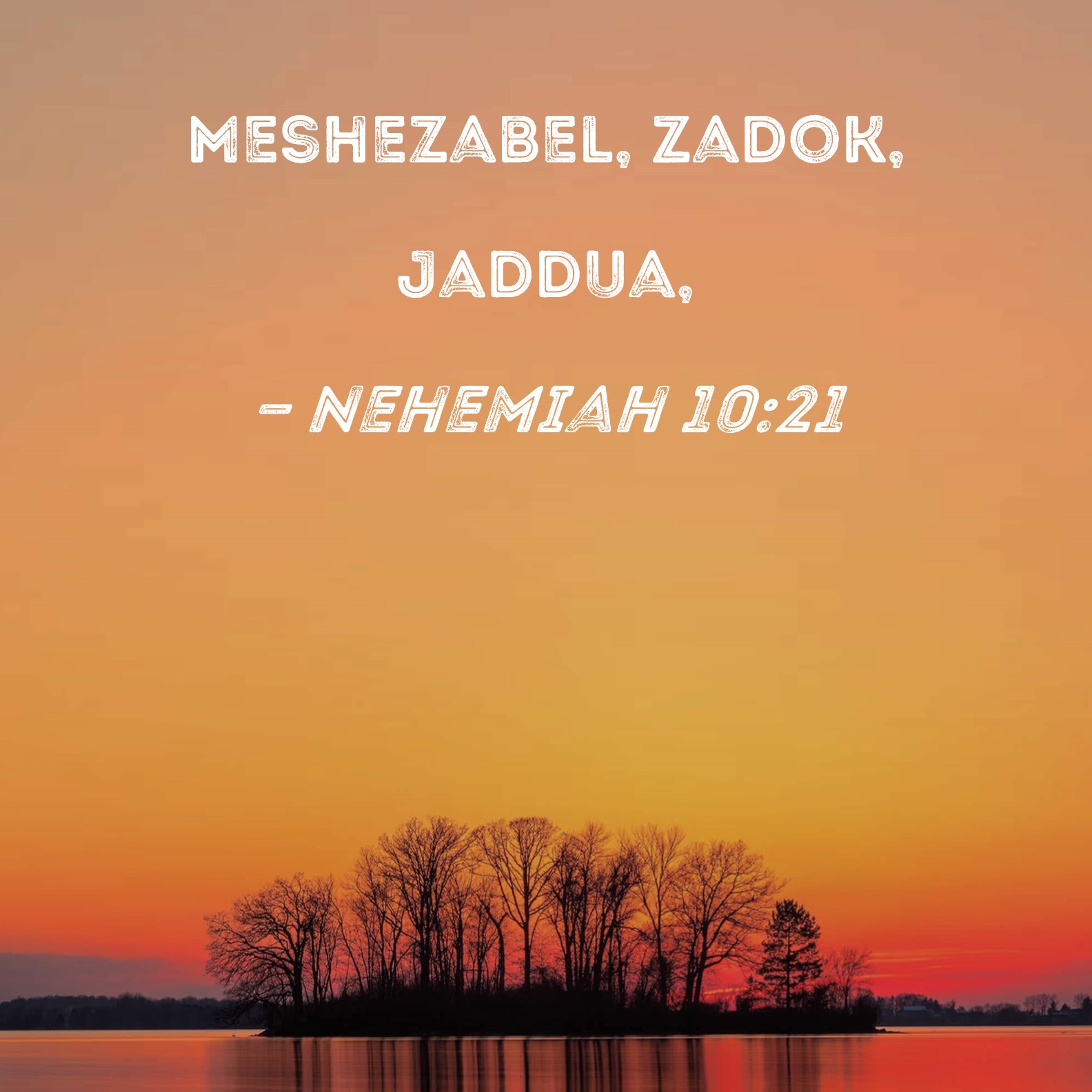 BSB: Meshezabel, Zadok, Jaddua, KJV: Meshezabeel, Zadok, Jaddua, DRB: Mesizabel, Sadoc, Jeddua, DBT: Meshezabeel, Zadok, Jaddua, ERV: Meshezabel, Zadok, Jaddua; WBT: Meshezabeel, Zadok, Jaddua, WEB: Meshezabel, Zadok, Jaddua, YLT: Meshezabeel, Zadok, Jaddua,Links Nehemiah 10:21 NIV • Nehemiah 10:21 NLT • Nehemiah 10:21 ESV • Nehemiah 10:21 NASB • Nehemiah 10:21 KJV • Nehemiah 10:21 Interlinear • Nehemiah 10:21 Commentaries • Nehemiah 10:21 Parallel Texts • Nehemiah 10:21 Bible Apps • Nehemiah 10:21 Parallel • Bible Hub |