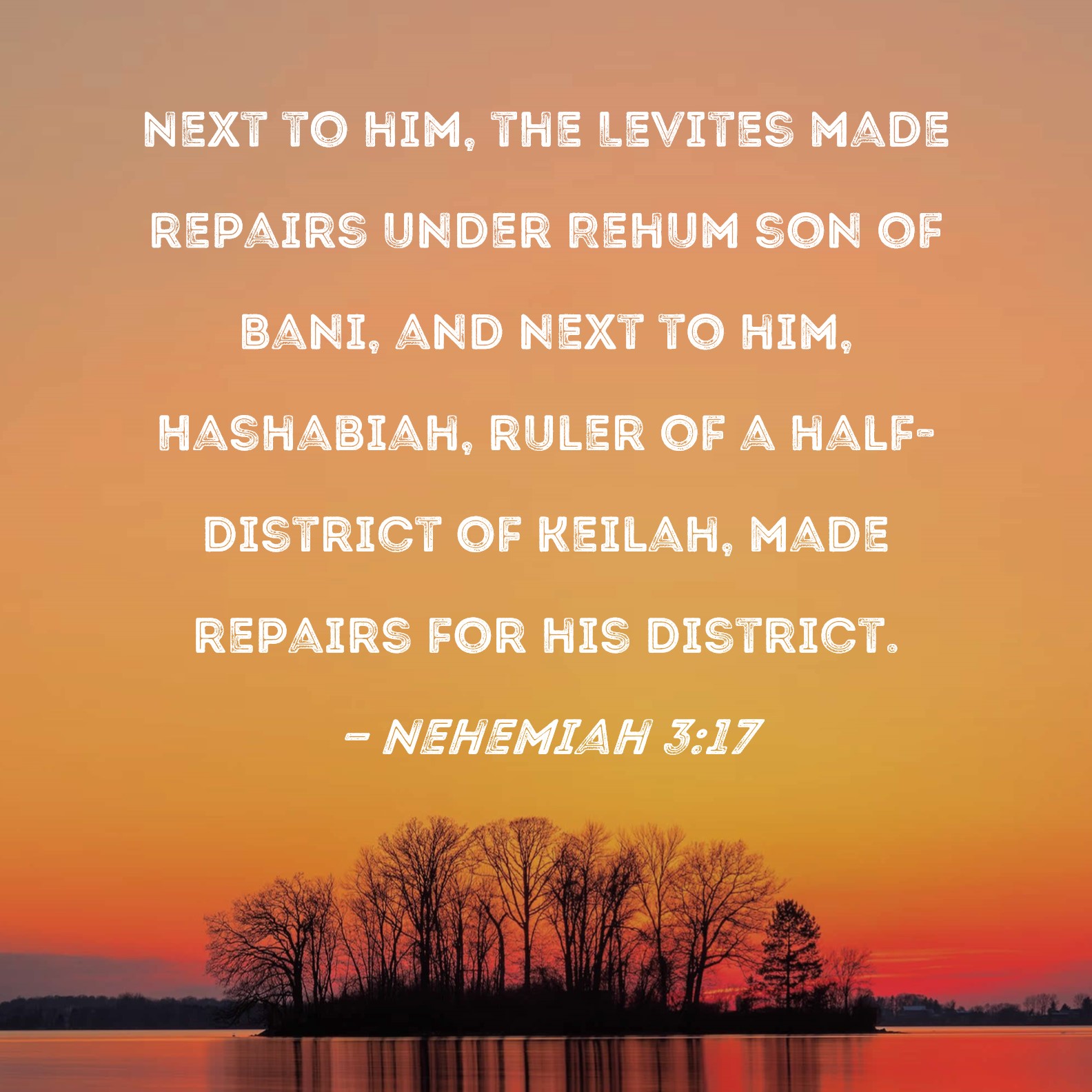 Nehemiah 3:17 Next to him, the Levites made repairs under Rehum son of Bani, and next to him, Hashabiah, ruler of a half-district of Keilah, made repairs for his district.