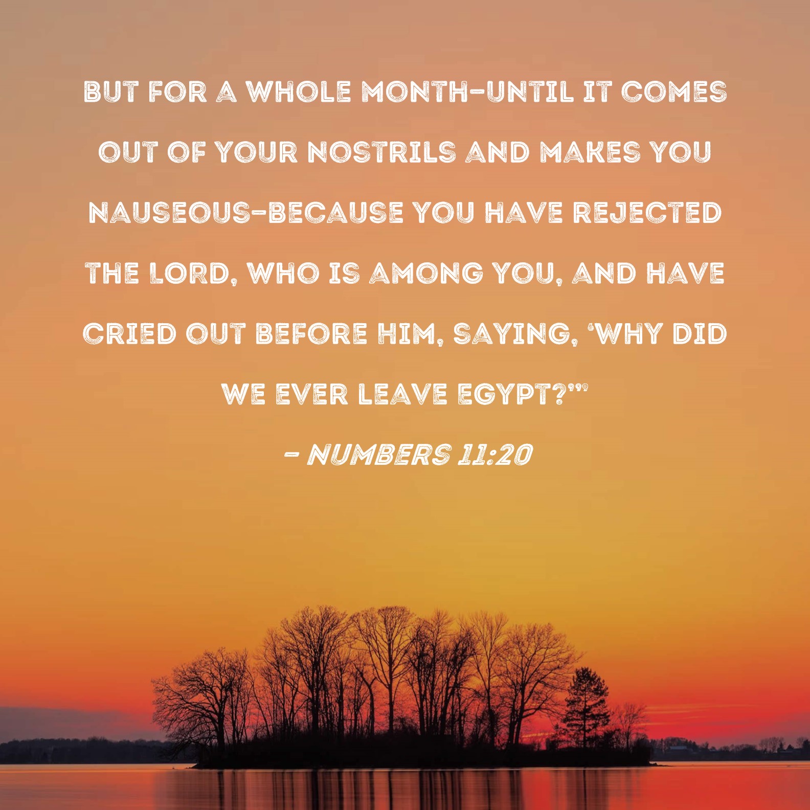 Numbers 11:20 but for a whole month--until it comes out of your nostrils and makes you nauseous--because you have rejected the LORD, who is among you, and have cried out before Him, saying, 'Why did we ever leave Egypt?'"