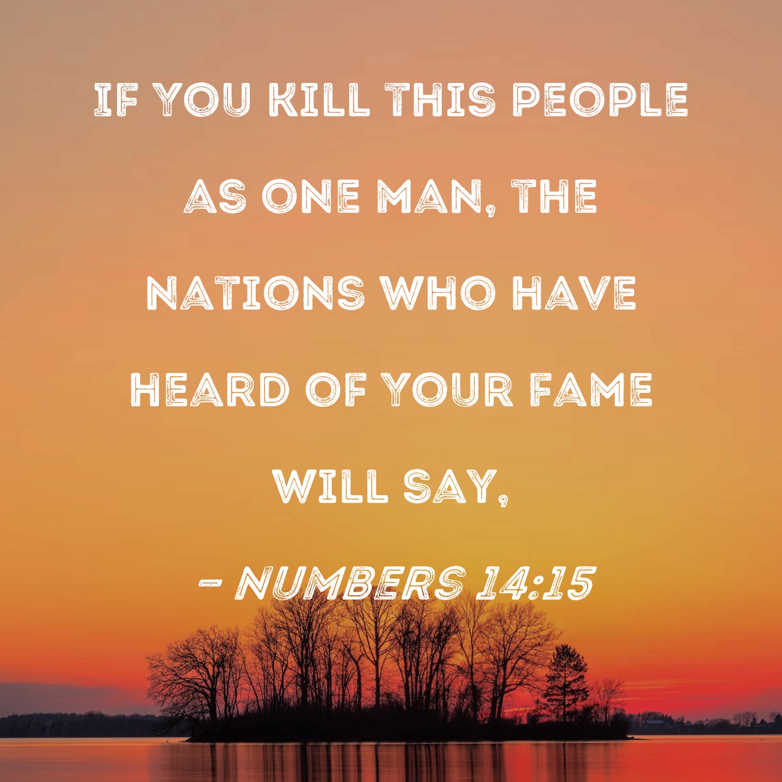 BSB: If You kill this people as one man, the nations who have heard of Your fame will say, KJV: Now if thou shalt kill all this people as one man, then the nations which have heard the fame of thee will speak, saying, DRB: May hear that thou hast killed so great a multitude as it were one man and may say: DBT: if thou now slayest this people as one man, then the nations that have heard thy fame will speak, saying, ERV: Now if thou shalt kill this people as one man, then the nations which have heard the fame of thee will speak, saying, WBT: Now if thou shalt kill all this people as one man, then the nations which have heard the fame of thee will speak, saying, WEB: Now if you killed this people as one man, then the nations which have heard the fame of you will speak, saying, YLT: 'And Thou hast put to death this people as one man, and the nations who have heard Thy fame have spoken, saying,Links Numbers 14:15 NIV • Numbers 14:15 NLT • Numbers 14:15 ESV • Numbers 14:15 NASB • Numbers 14:15 KJV • Numbers 14:15 Interlinear • Numbers 14:15 Commentaries • Numbers 14:15 Parallel Texts • Numbers 14:15 Bible Apps • Numbers 14:15 Parallel • Bible Hub |