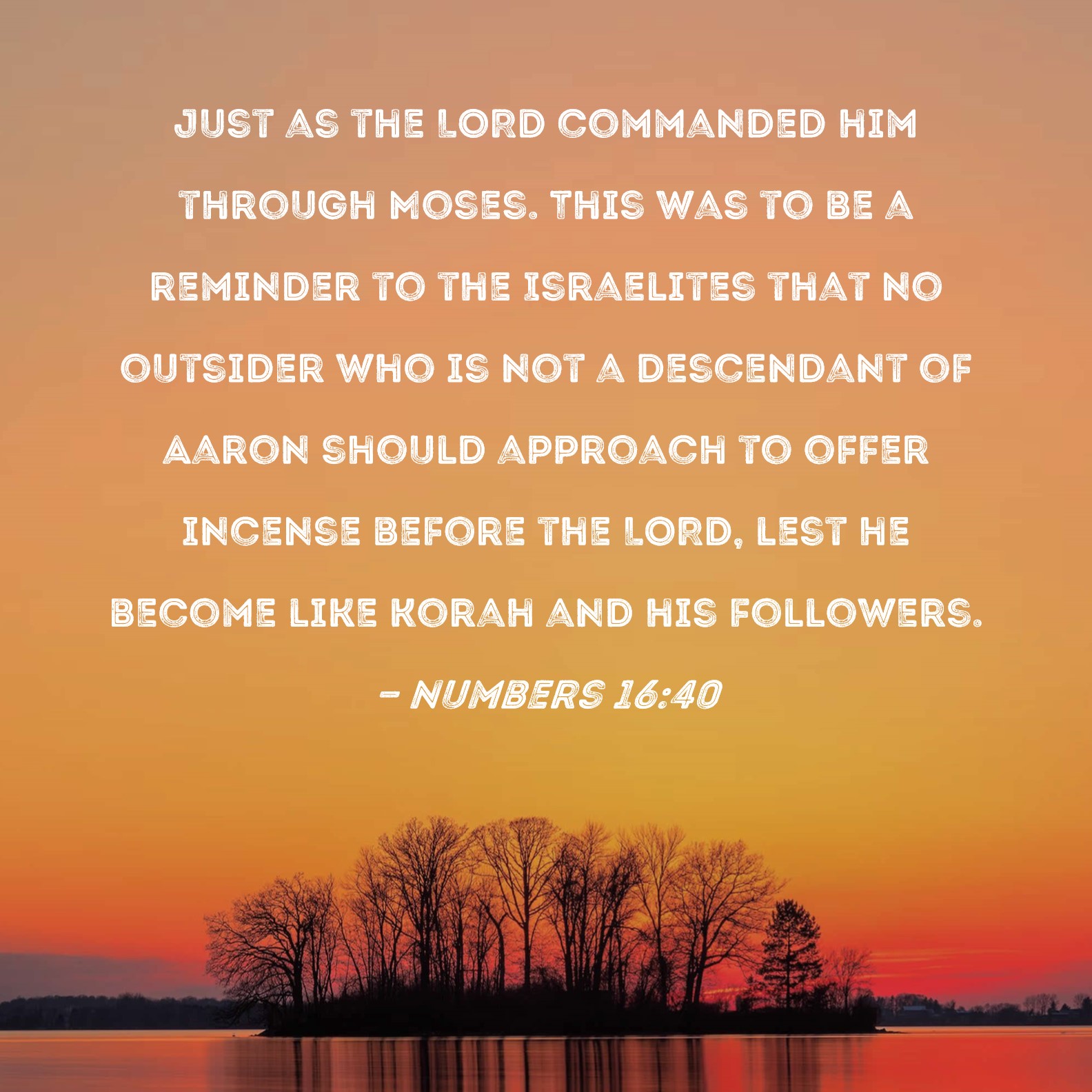 Numbers 16:40 just as the LORD commanded him through Moses. This was to be a reminder to the Israelites that no outsider who is not a descendant of Aaron should approach to offer incense before the LORD, lest he become like Korah and his followers.