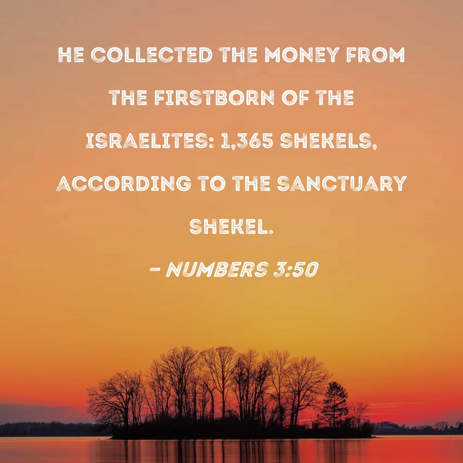 Numbers 3:50 He collected the money from the firstborn of the Israelites: 1,365 shekels, according to the sanctuary shekel.