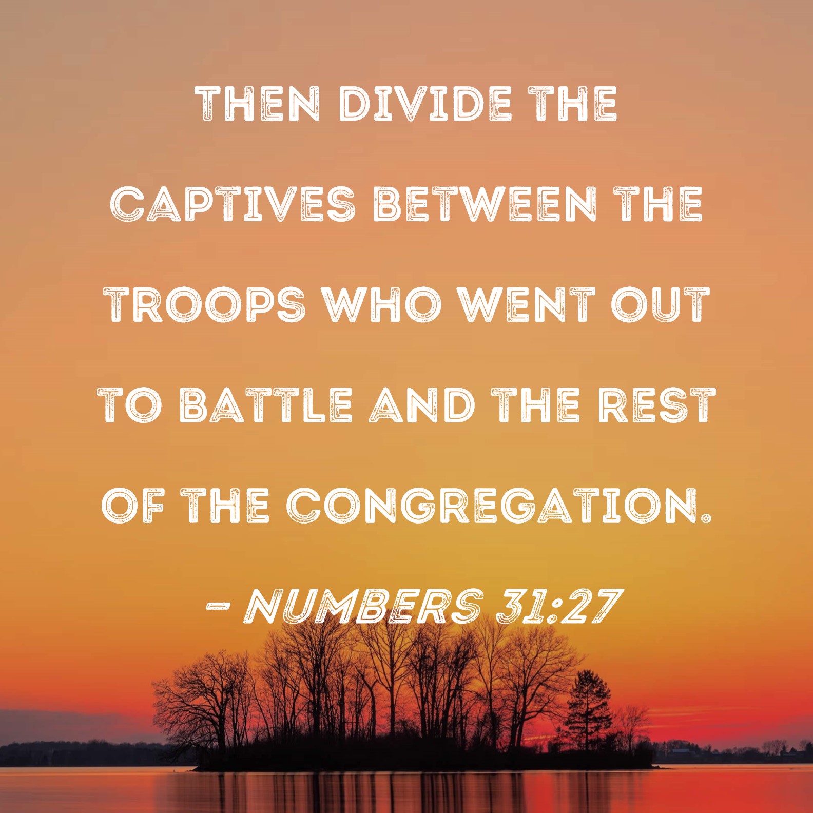 Numbers 31:27 Then divide the captives between the troops who went out to battle and the rest of the congregation.