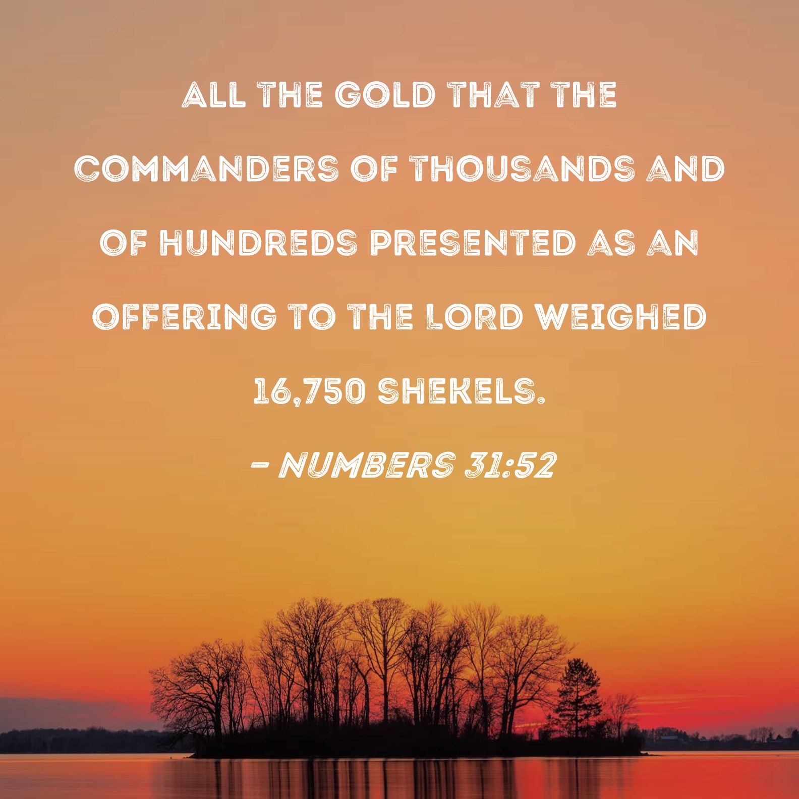 Numbers 31:52 All the gold that the commanders of thousands and of hundreds presented as an offering to the LORD weighed 16,750 shekels.