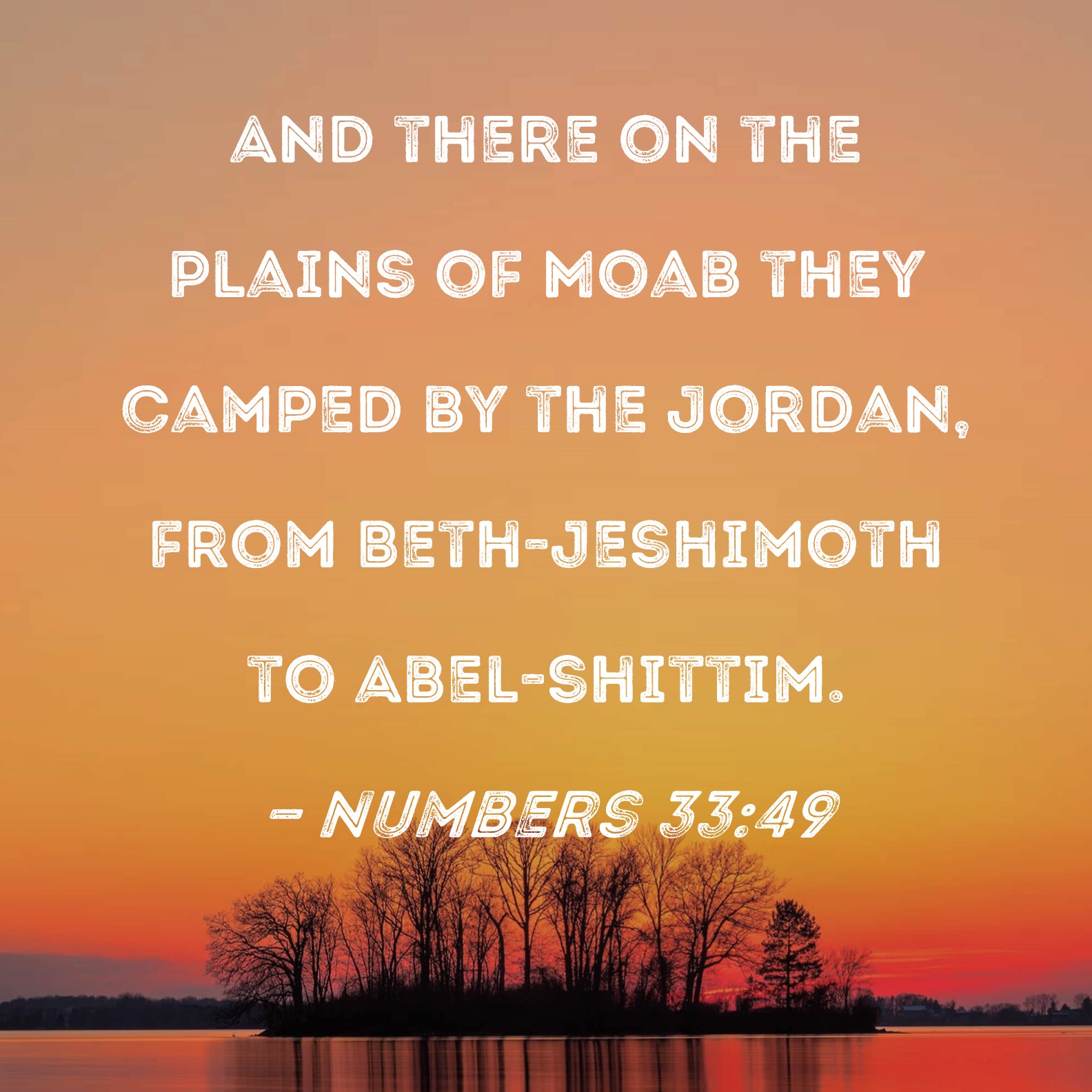 Numbers 33:49 And there on the plains of Moab they camped by the Jordan, from Beth-jeshimoth to Abel-shittim.