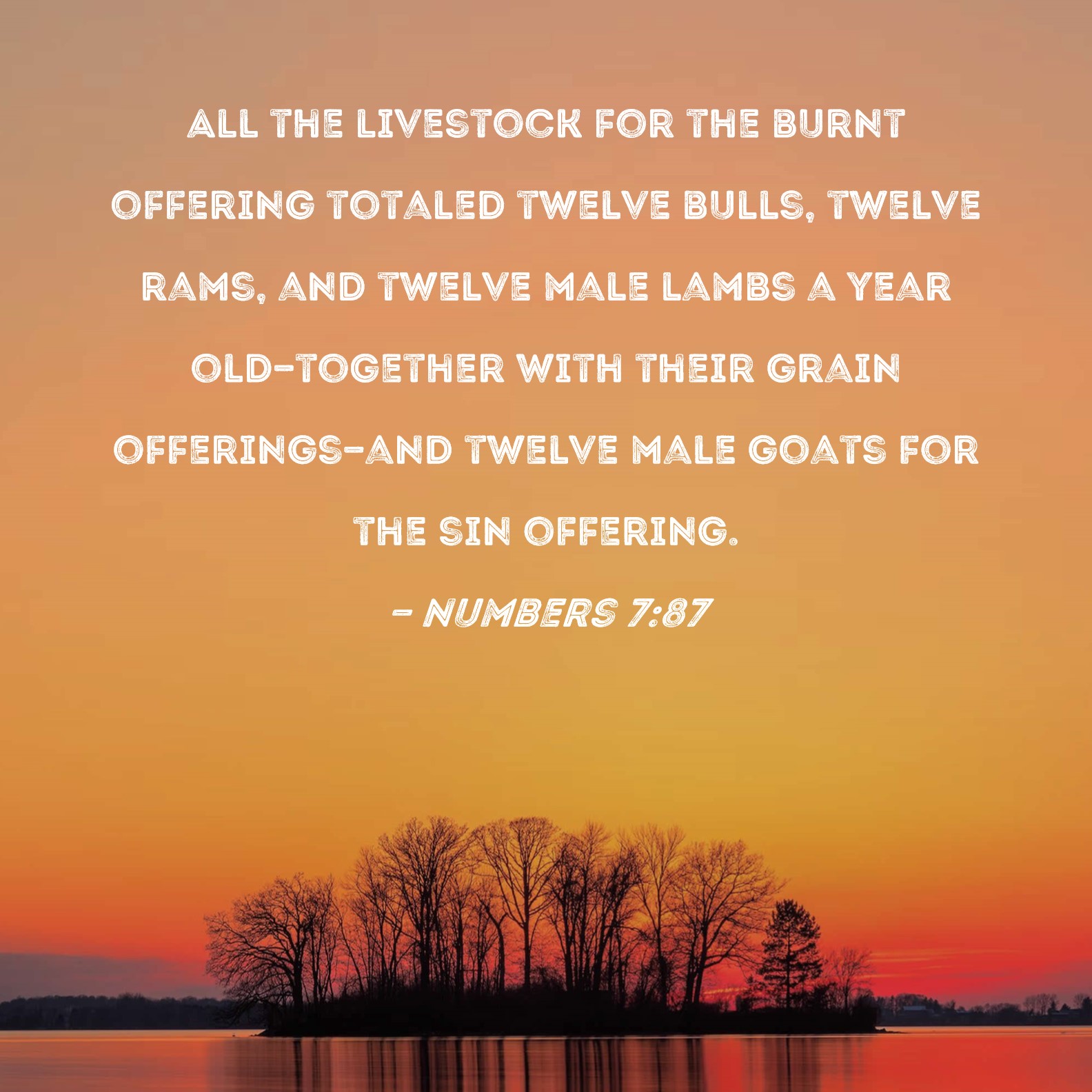 Numbers 7:87 All the livestock for the burnt offering totaled twelve bulls, twelve rams, and twelve male lambs a year old--together with their grain offerings--and twelve male goats for the sin offering.