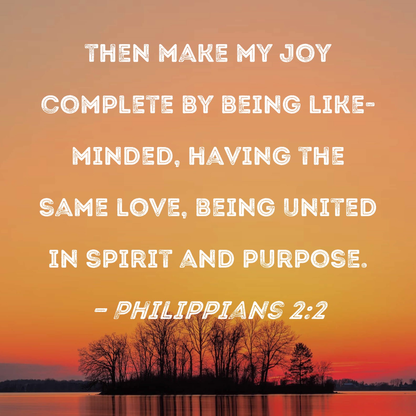 Philippians 2:2 then make my joy complete by being like-minded, having the same love, being united in spirit and purpose.