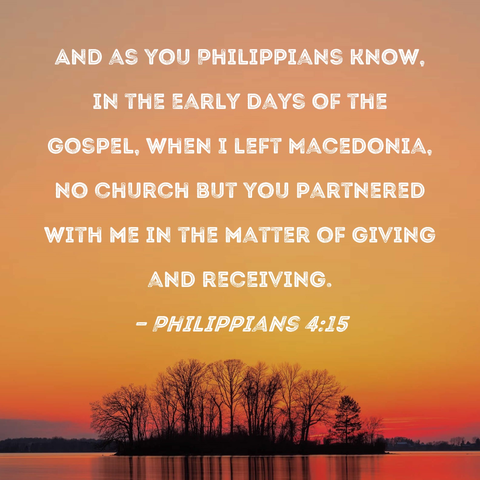 Philippians 4:15 And as you Philippians know, in the early days of the gospel, when I left Macedonia, no church but you partnered with me in the matter of giving and receiving.