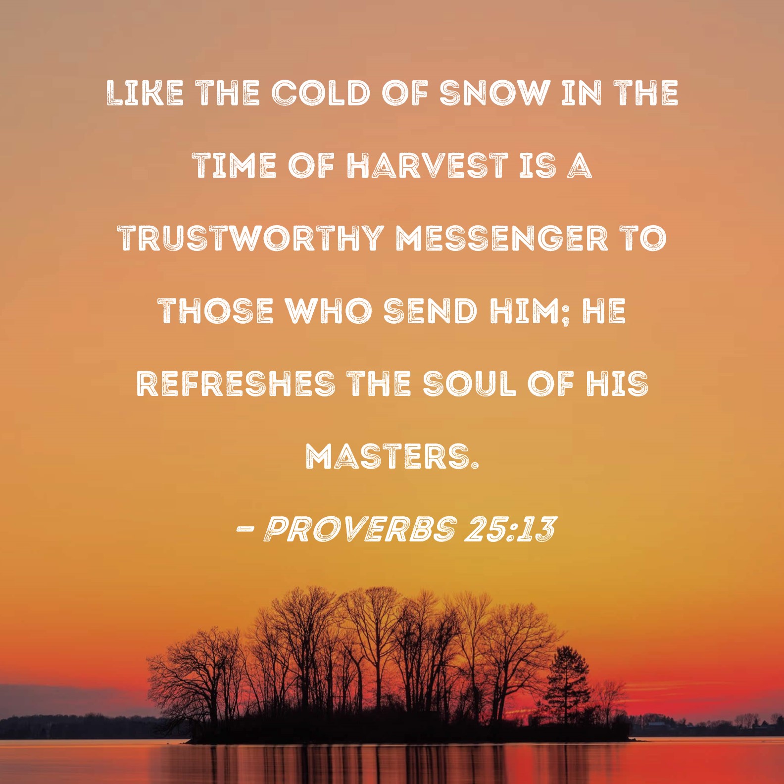 Proverbs 25:13 Like the cold of snow in the time of harvest is a trustworthy messenger to those who send him; he refreshes the soul of his masters.