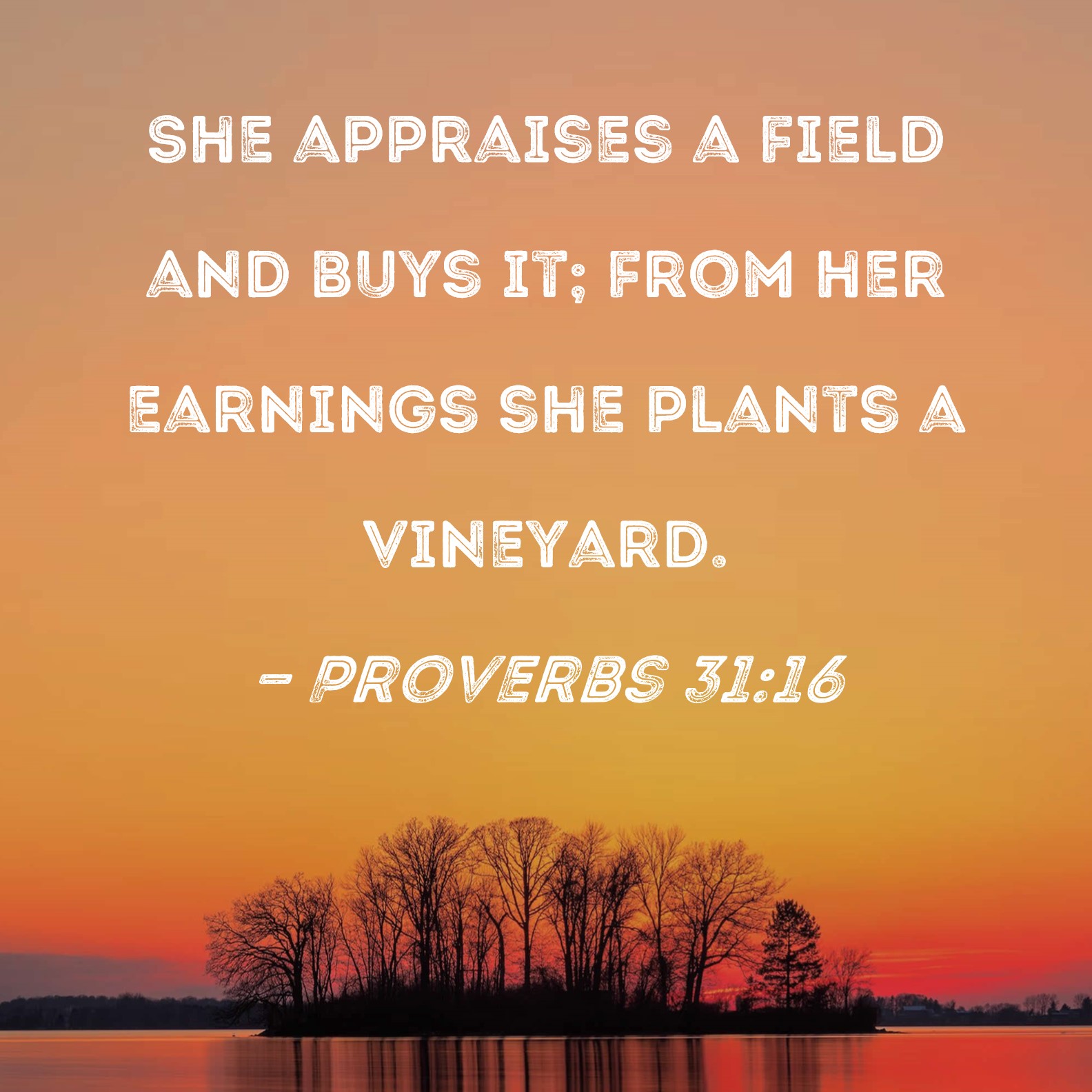 Proverbs 31:16 She appraises a field and buys it; from her earnings she plants a vineyard.