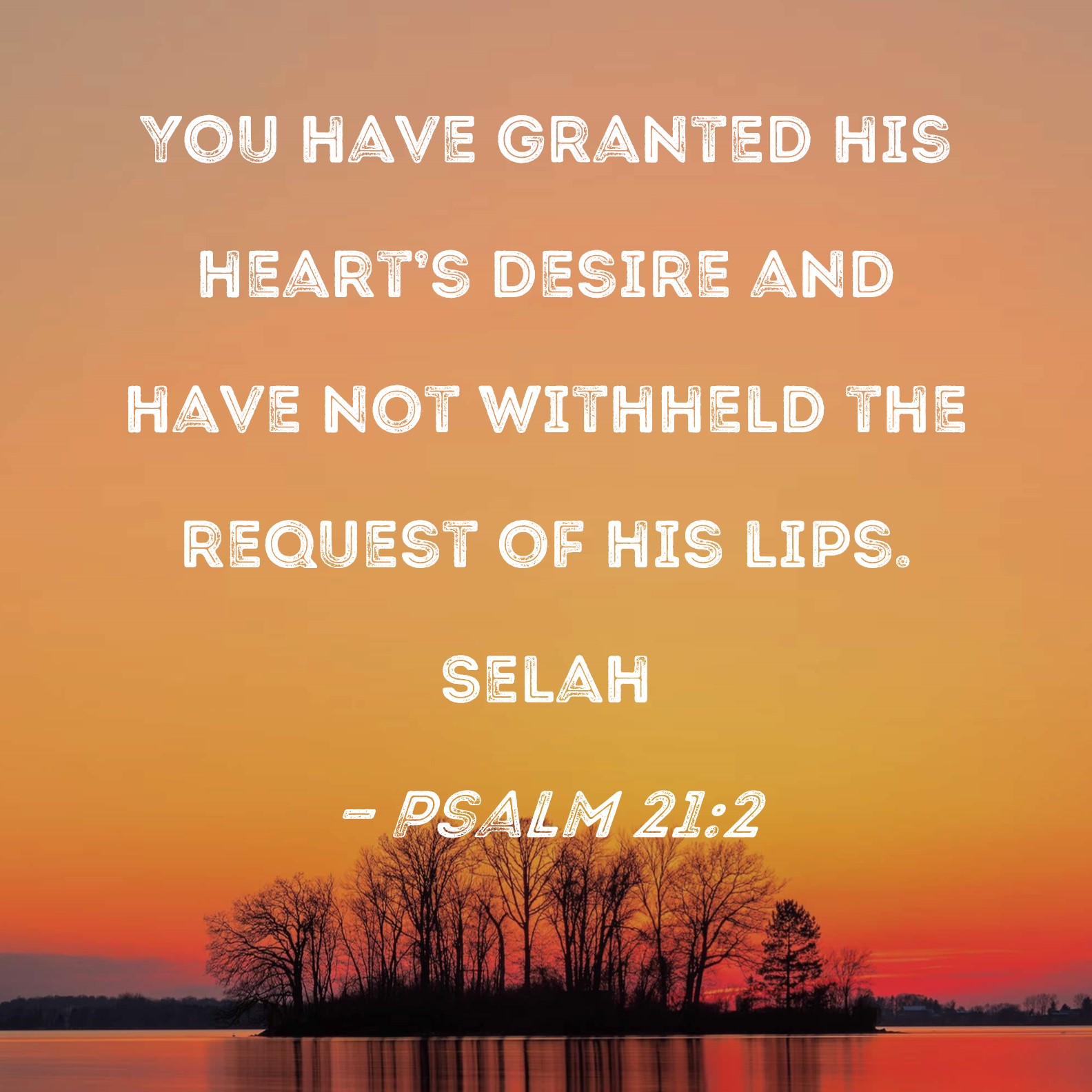 Psalm 21:2 You have granted his heart's desire and have not withheld the request of his lips. Selah