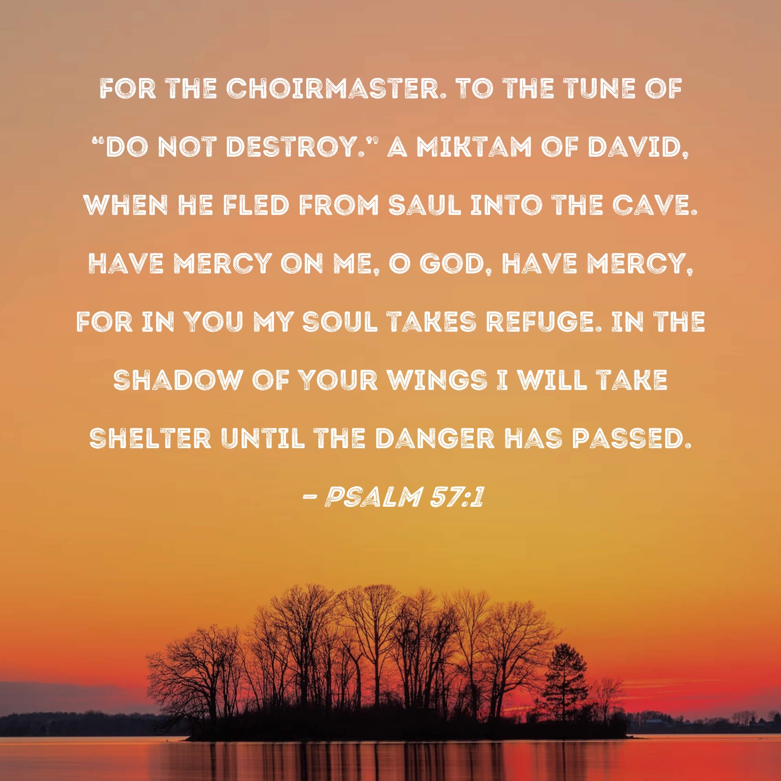 Psalm 57:1 For the choirmaster. To the tune of "Do Not Destroy." A Miktam of David, when he fled from Saul into the cave. Have mercy on me, O God, have mercy, for in You my soul takes refuge. In the shadow of Your wings I will take shelter until the danger has passed.